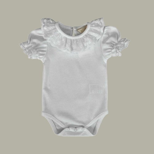 Body de manga curta ideal para bebé menina. Body manga curta branco é produzido em malha de algodão leve, com uma gola bordada com folho em tecido. Aperta nas costas e entre as pernas com molas. Bordado disponível em várias cores.