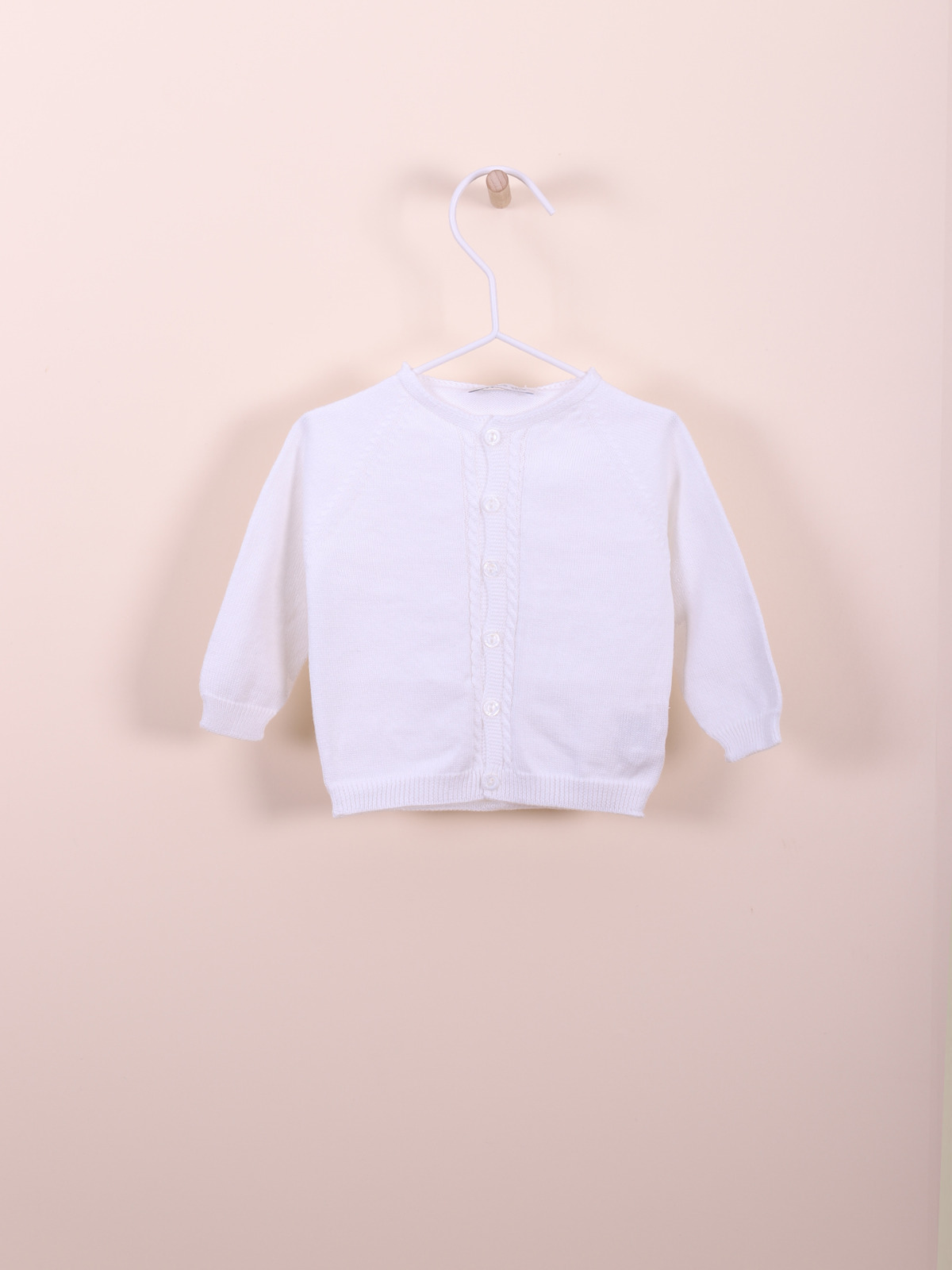 | Casaco de manga comprida tricotado em malha de algodão suave, ideal para bebés. O casaco com decote redondo aperta na frente com botões madre pérola. Produzido em Wholegarment, uma peça completa sem costuras, para maior conforto do seu bebé.