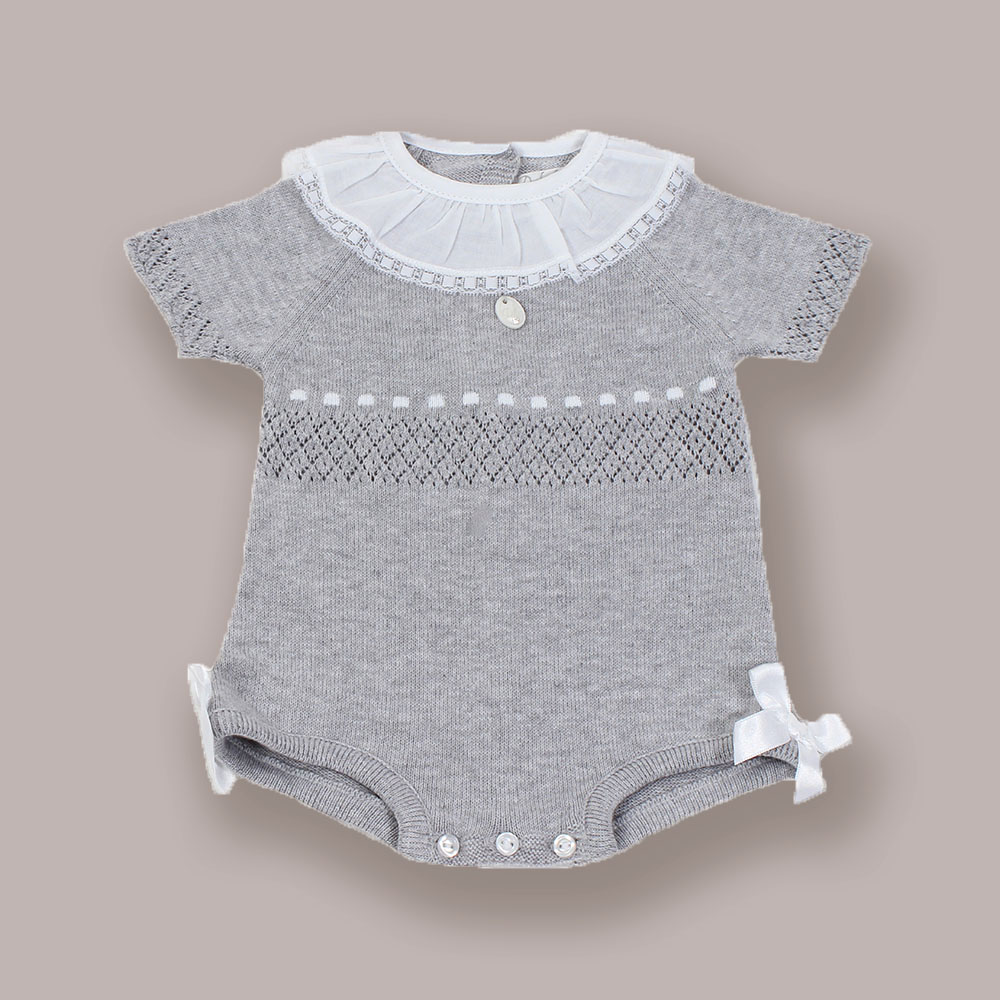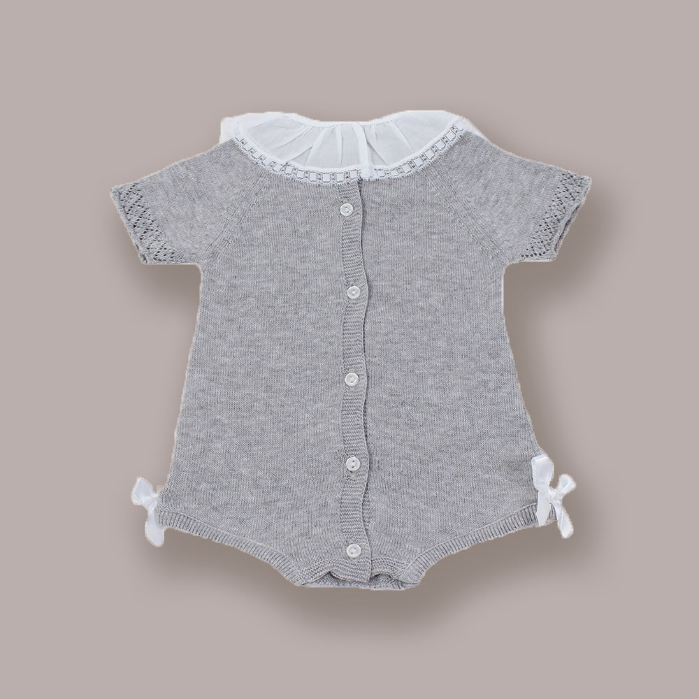Fofo de malha com gola e laçinhos de cetim laterais.. Aperta nas costas e entre pernas com botões.