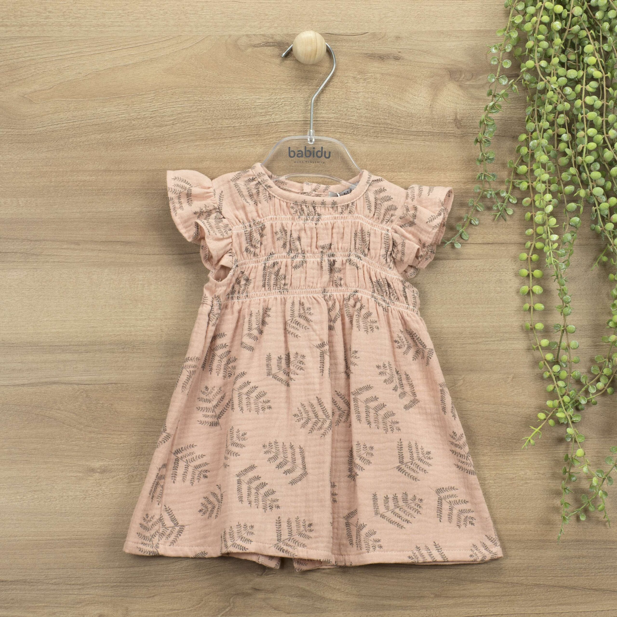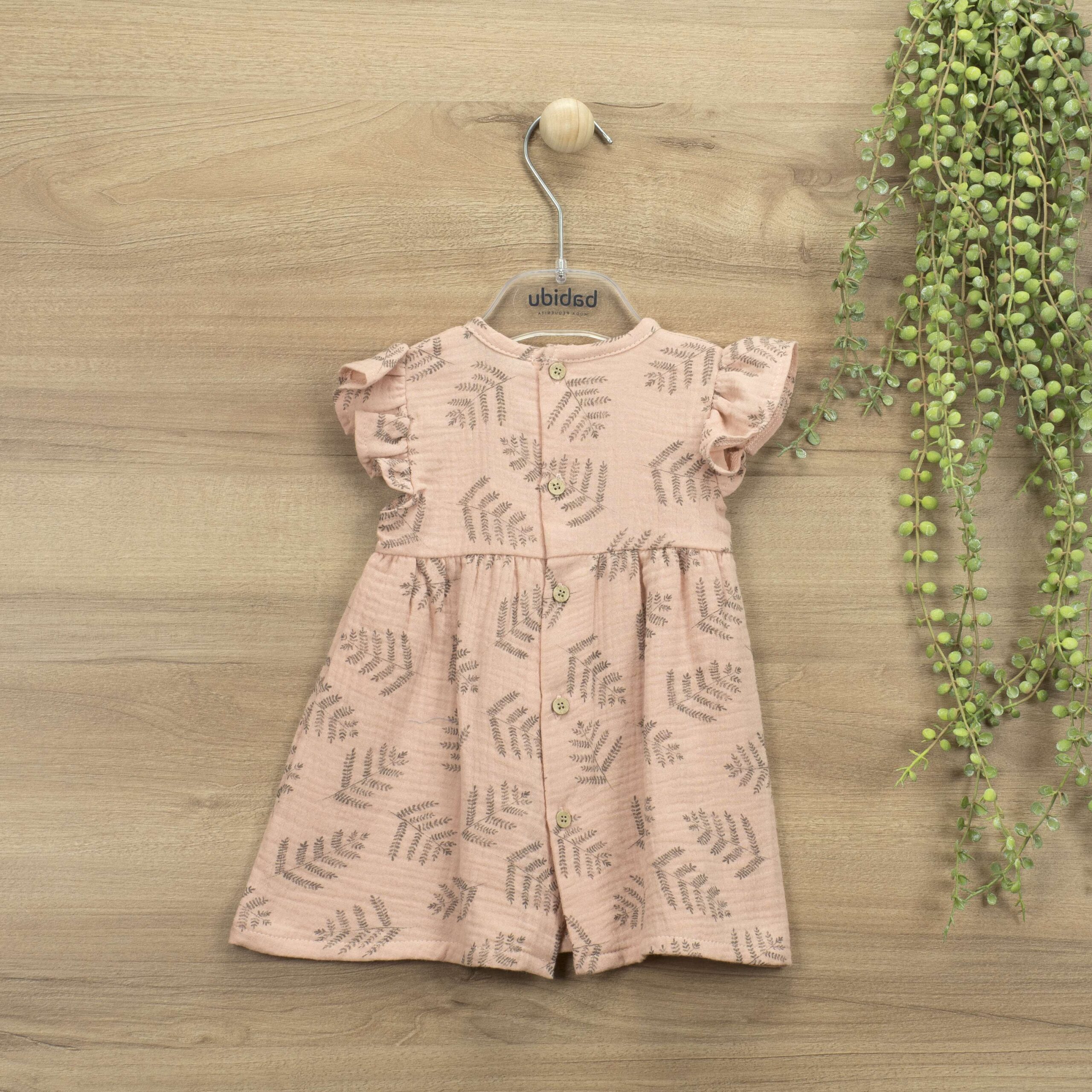 Coleção Aloha. Vestido com pormenor frontal efeito ninho de abelha, manga curta com folho. abertura nas costas com botões em madeira.