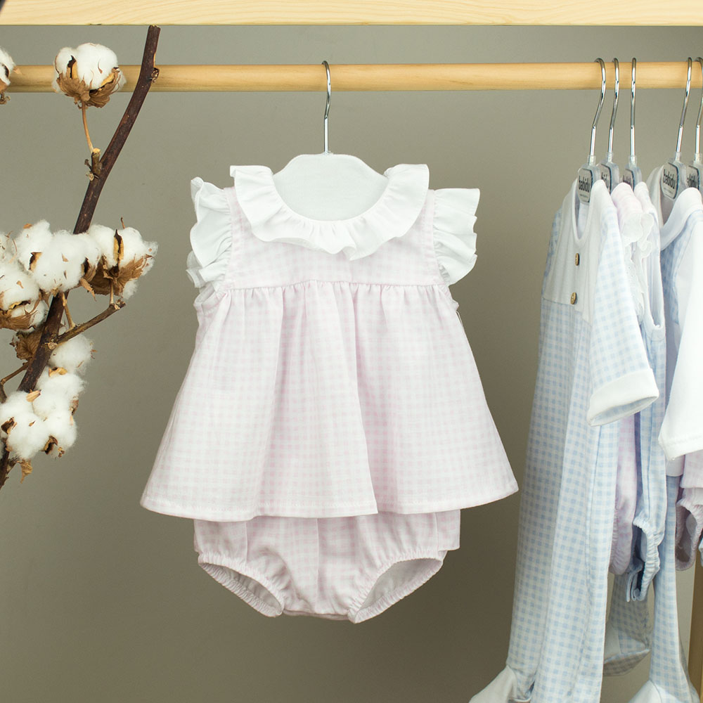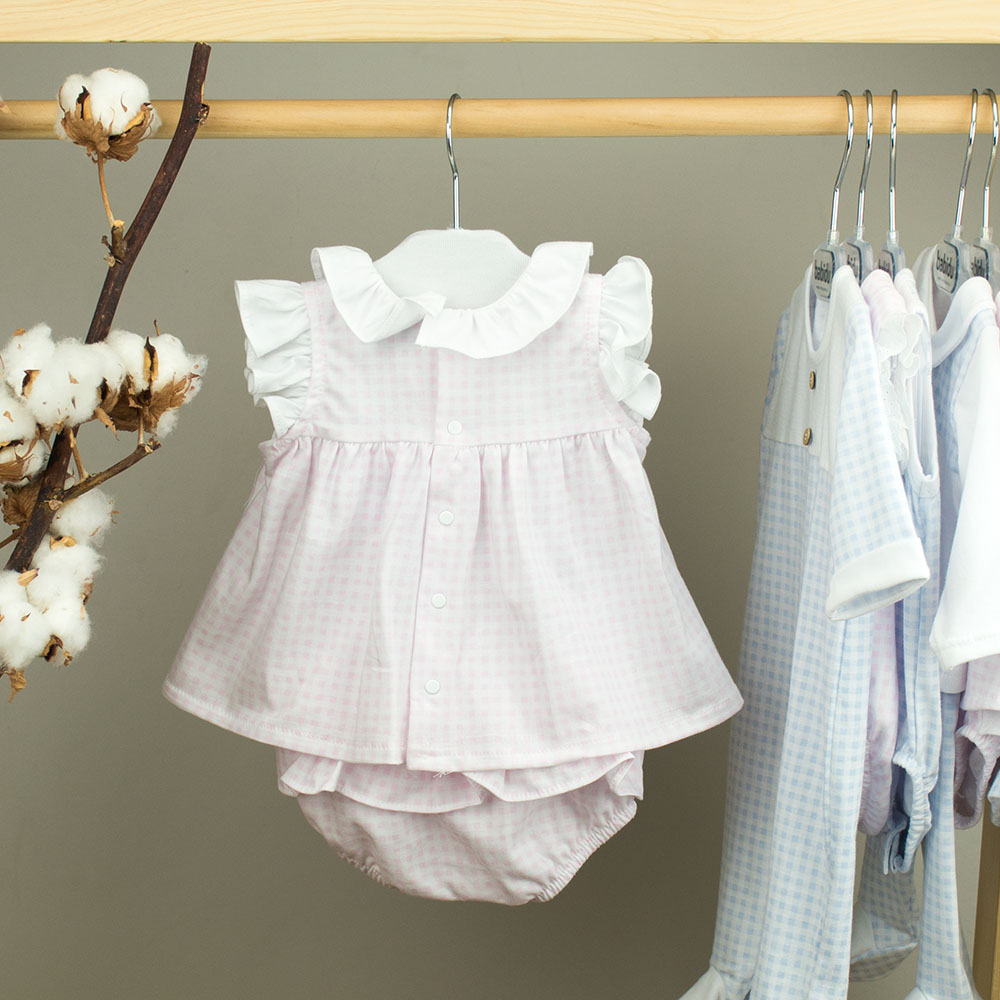 Vestido e tapa fraldas padrão Vichy. Vestido com golinha branca e manga cava com folhinho. Abertura nas costas com molas de pressão para vestir facilmente. Tapa fraldas com folhos