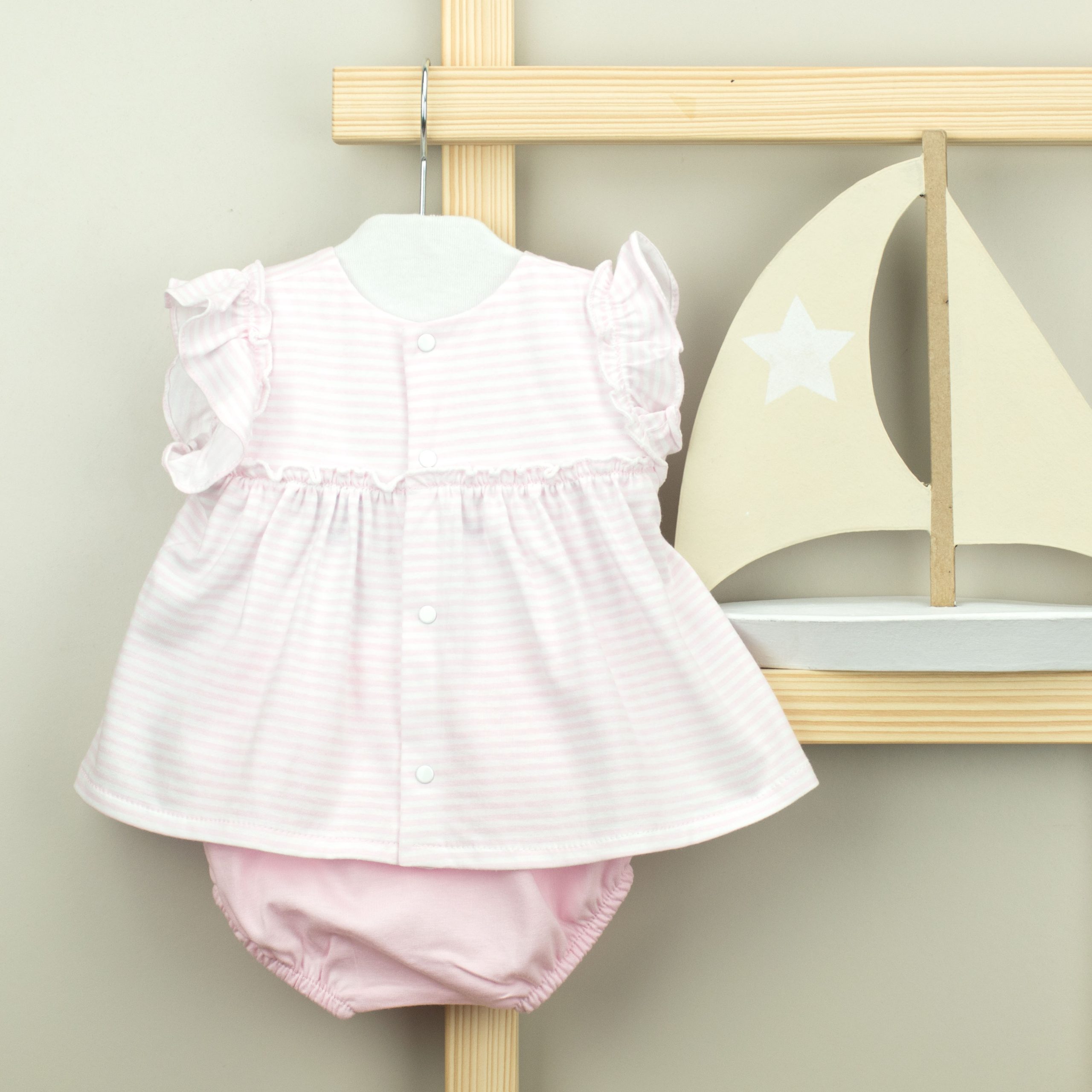 Coleção Sailor, vestido com Tapa fraldas, manga cava e folhinho, abertura nas costas com molas de pressão para vestir facilmente. Composição: 100% algodão.