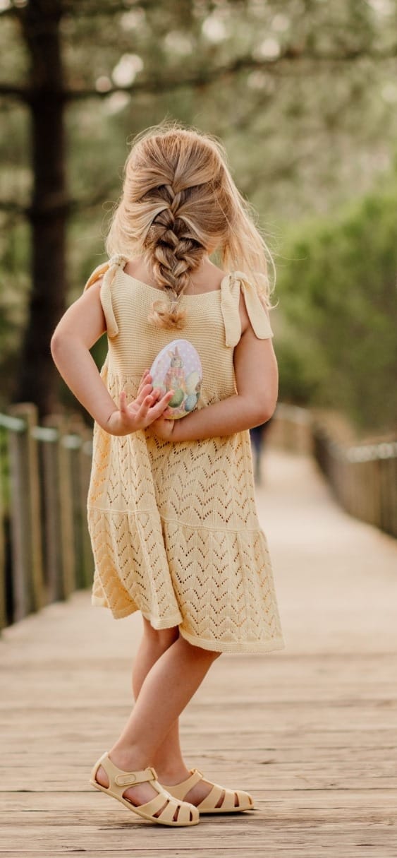 Vestido de alças tricotado em malha de algodão orgânico suave . Aperta nas alças com laço.