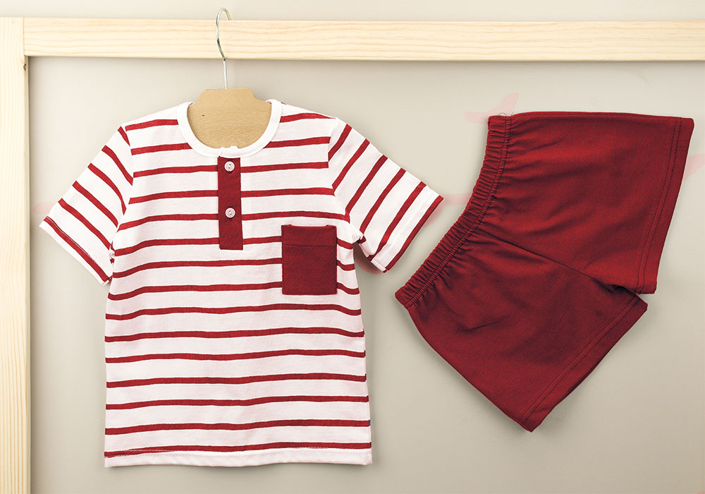 Conjunto da coleção Ella para menino, composto por calção com detalhe frontal de três botões decorativos em madeira. T-Shirt com botões em madeira no ombro.