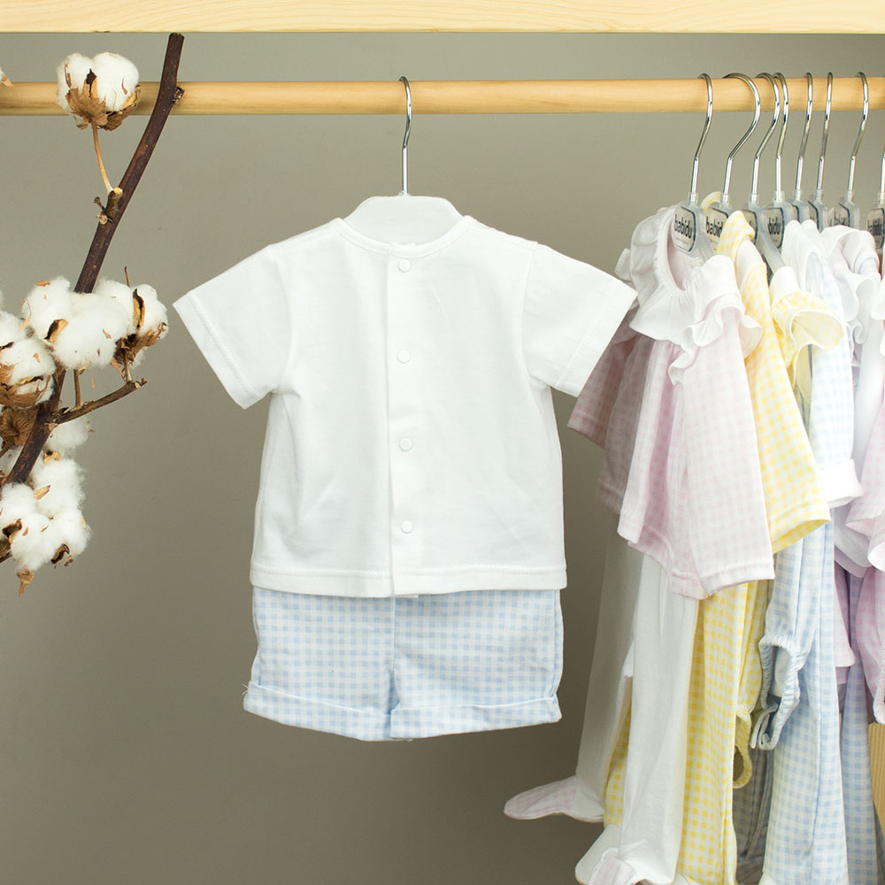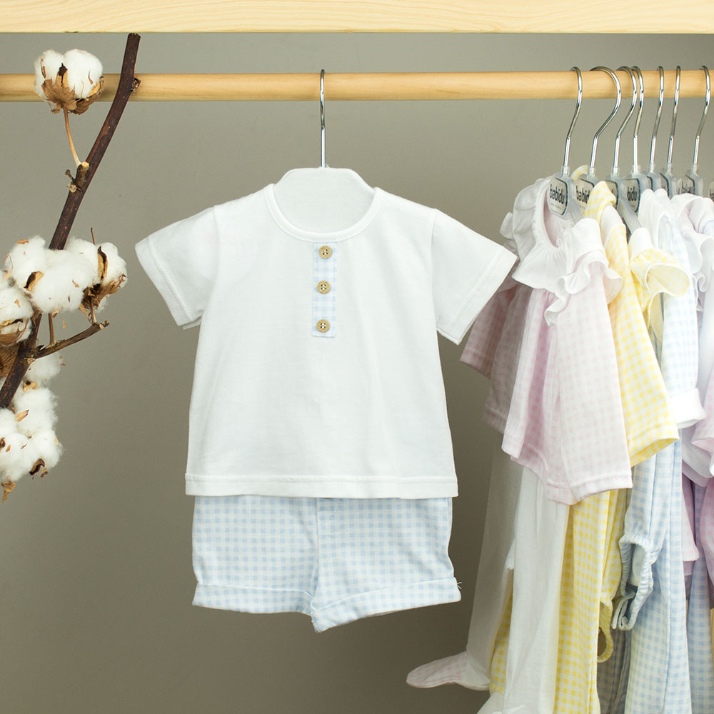 Conjunto para menino, composto por T-Shirt com Botões frontais decorativos e molas de pressão nas costas. Calção padrão Vichy com botões frontais decorativos.