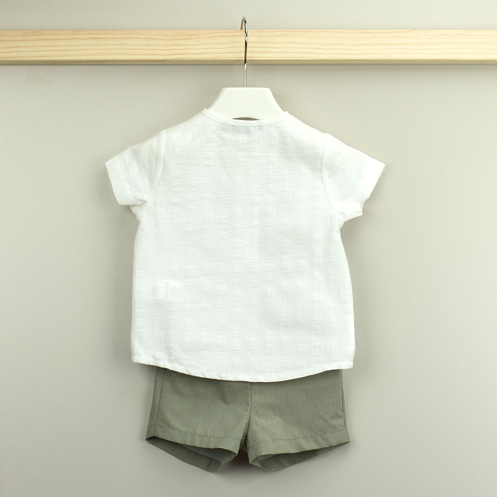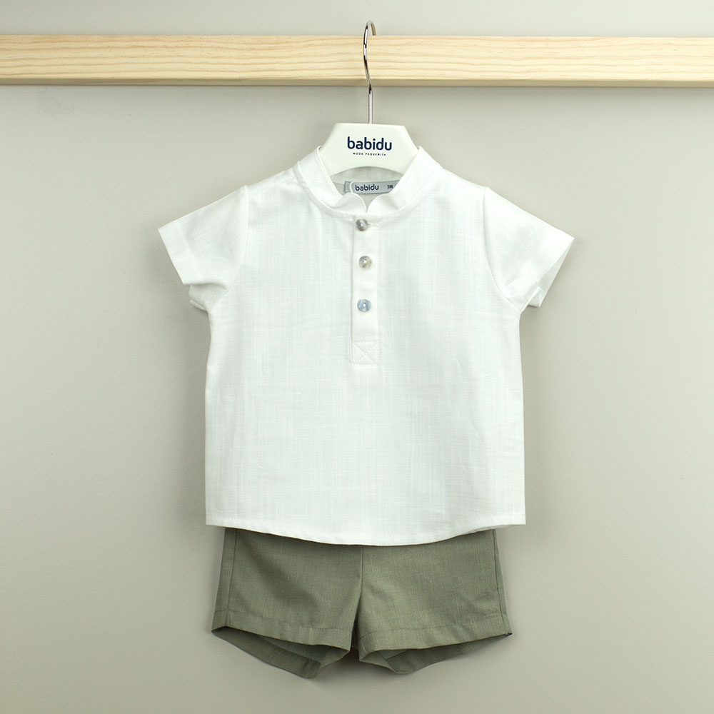 O conjunto Mia é composto por uma camisa e uns calções. Camisa em linho de manga curta com gola redonda e botões em madeira. Calções com bolsos laterias e elásticos na cintura, permitindo o máximo conforto.