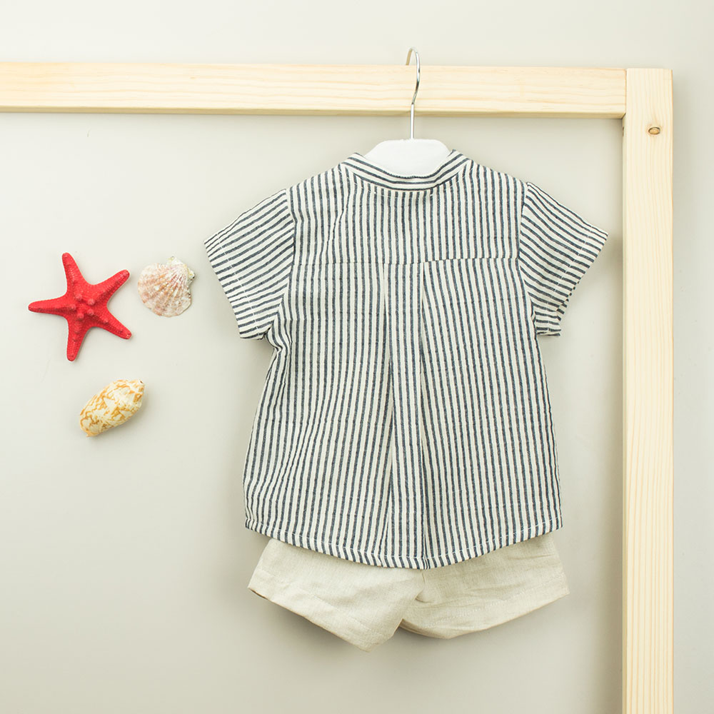 Conjunto Minerva composto por calção em linho com bolsos laterais e camisa em algodão orgânico, de manga curta com botões em madeira.