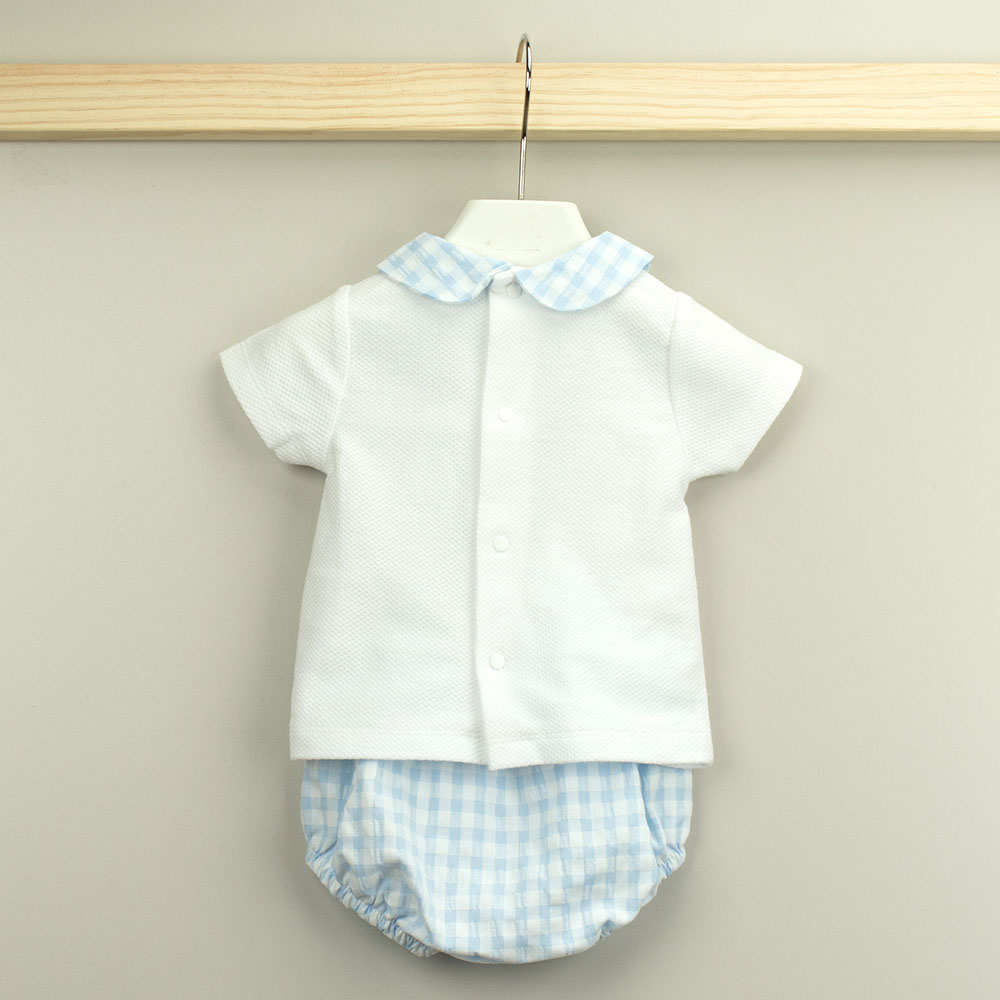 Coleção Alba conjunto composto por camisa e tapa fraldas. Camisa em piquet com gola padrão Vichy pormenor frontal com favo de mel e abertura nas costas com molas de pressão. Tapa fraldas em padrão Vichy.