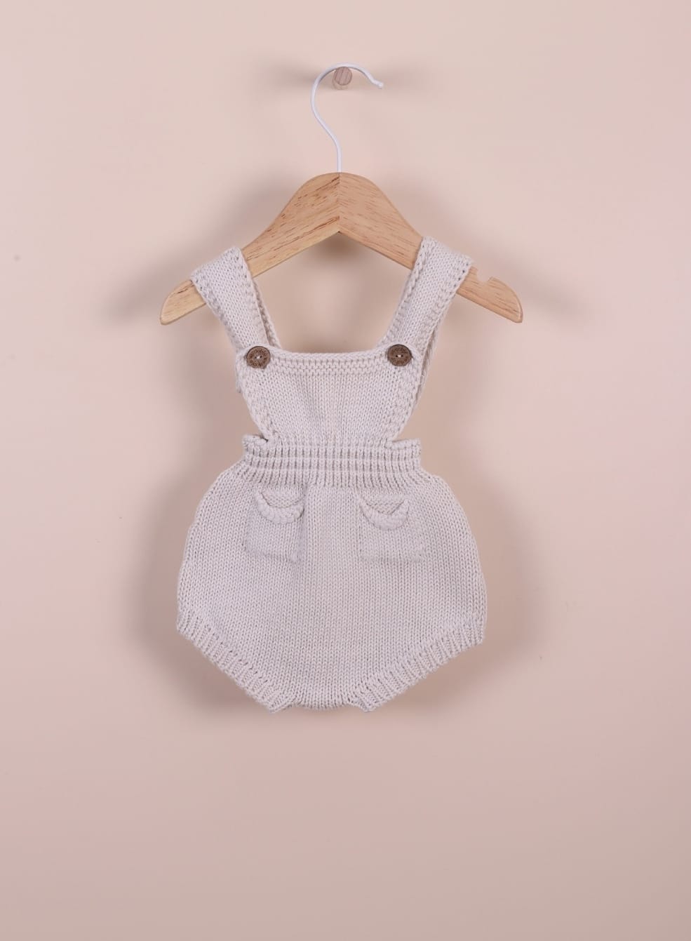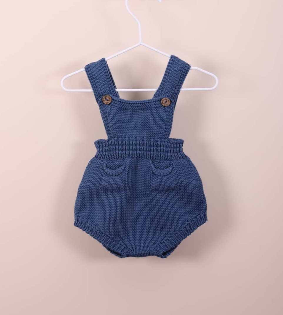Fofo de alças tricotado em malha de algodão suave, ideal para bebés meninos e meninas, até aos 24 meses. O fofo alças com dois queridos bolsos na frente, aperta nas alças com botões de côco. Produzido em Wholegarment, uma peça completa sem costuras, para maior conforto do seu bebé.