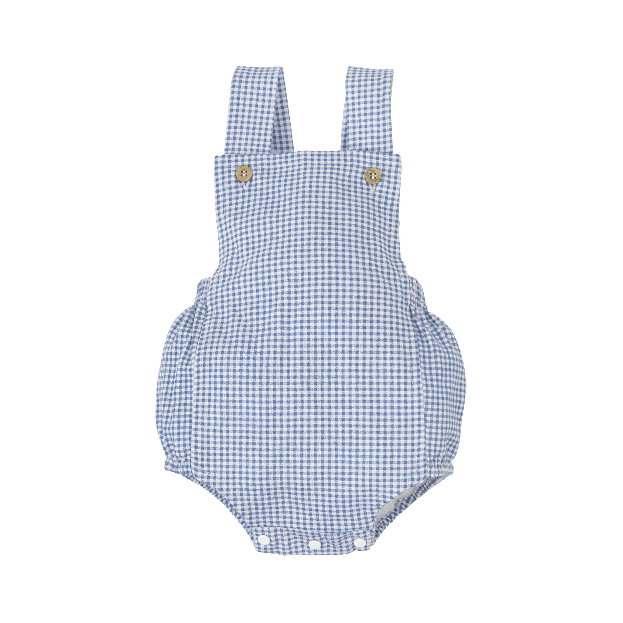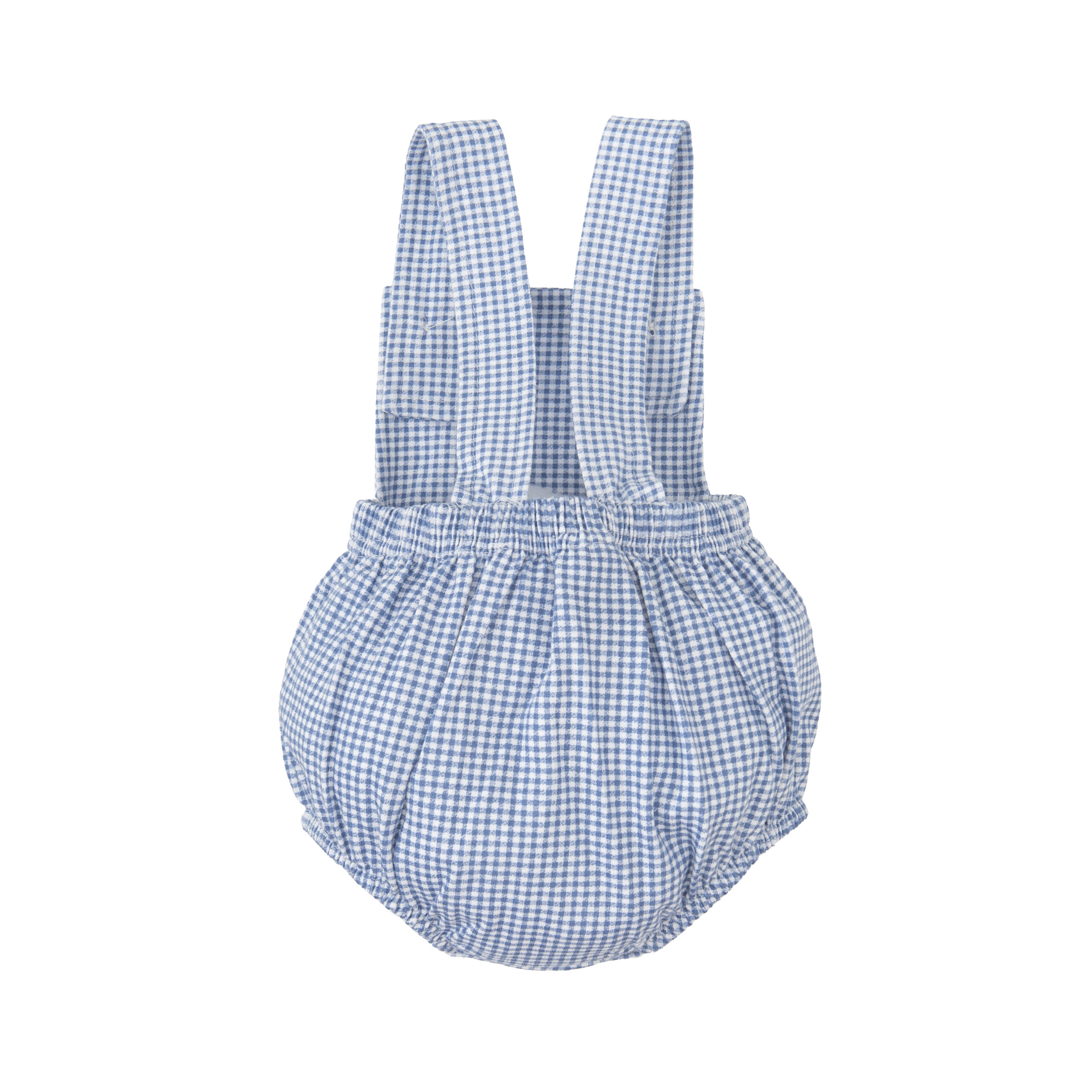 Fofo de alças com padrão de pequenos quadrados. As alças cruzam atrás e apertam na frente com botões em madeira. Elásticos nas pernas e dos lados nas costa, molas de pressão entrepernas .
