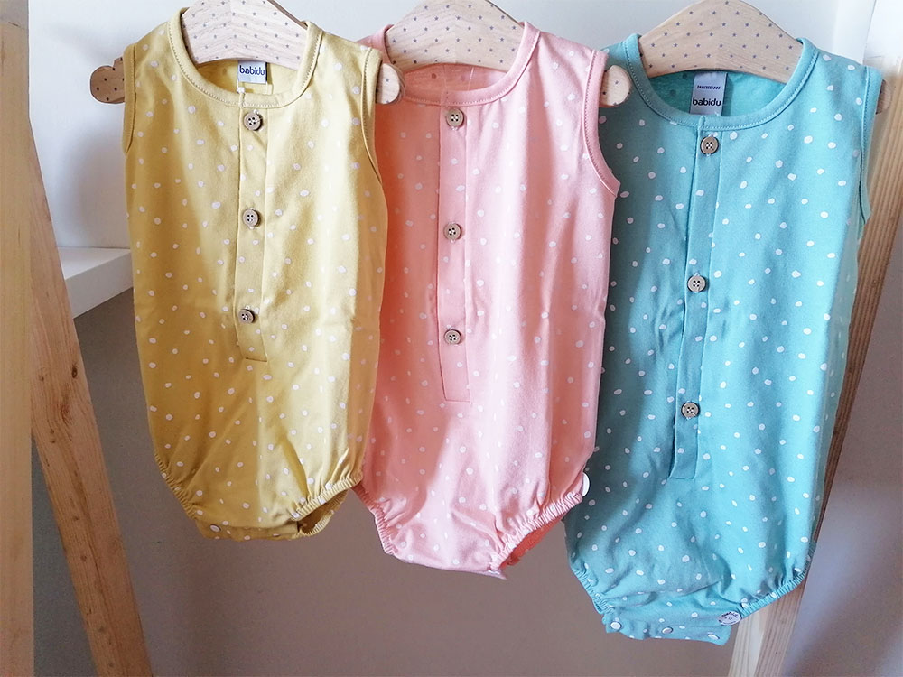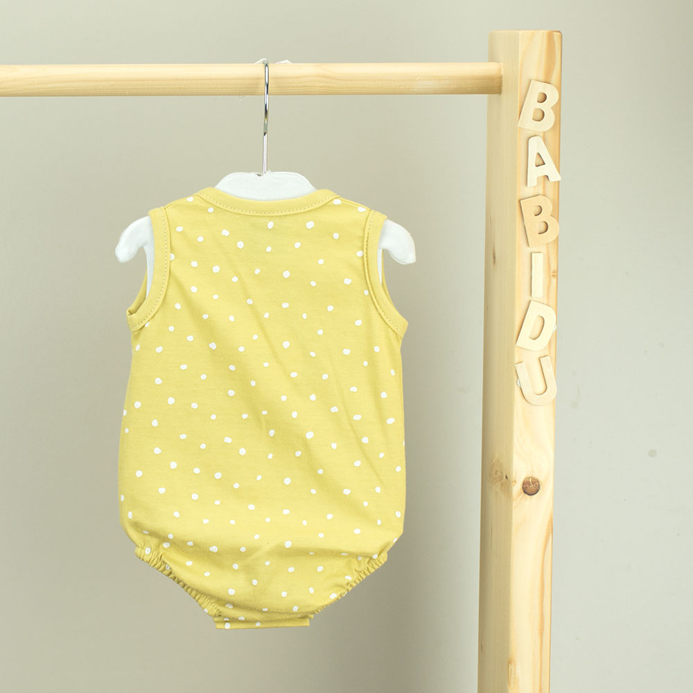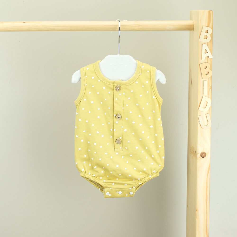 Macacão curto bolinhas, abertura a frente com botões em madeira e molas entre pernas para vestir facilmente.