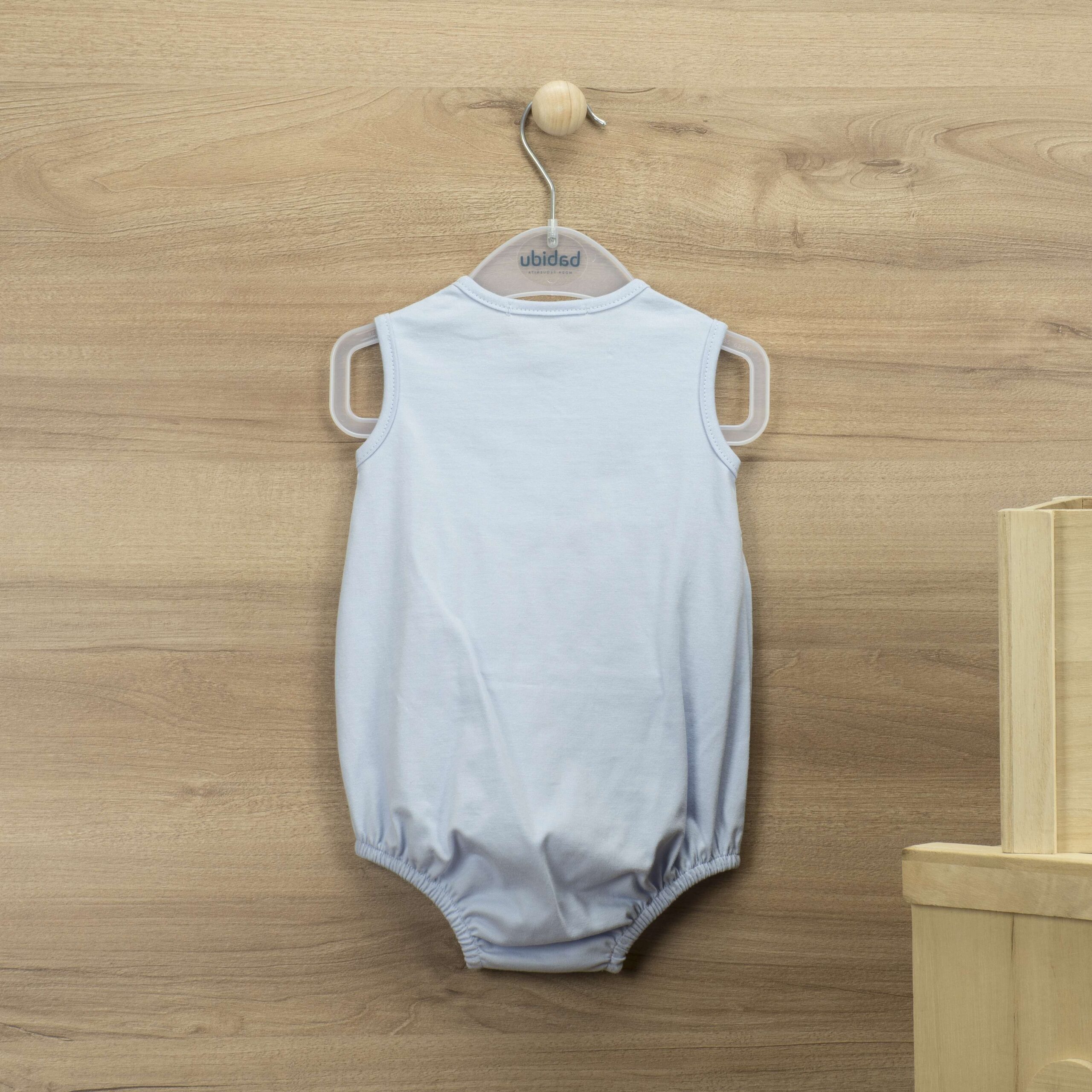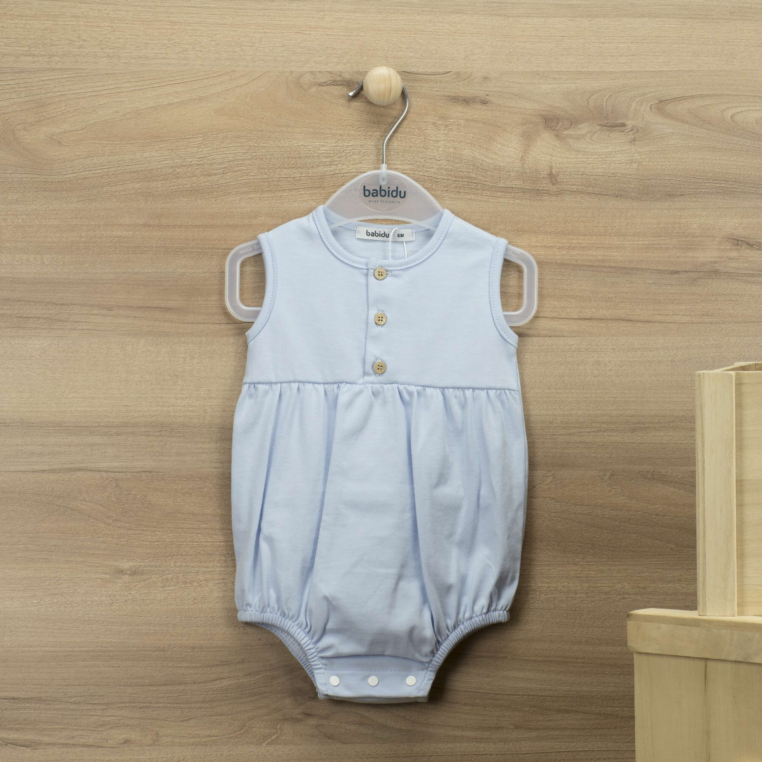 Fofo de alças tricotado em malha fina de algodão orgânico, suave e respirável, ideal para bebés recém nascidos. O fofo Organic Baby aperta nas alças e entre pernas com botões em madeira.