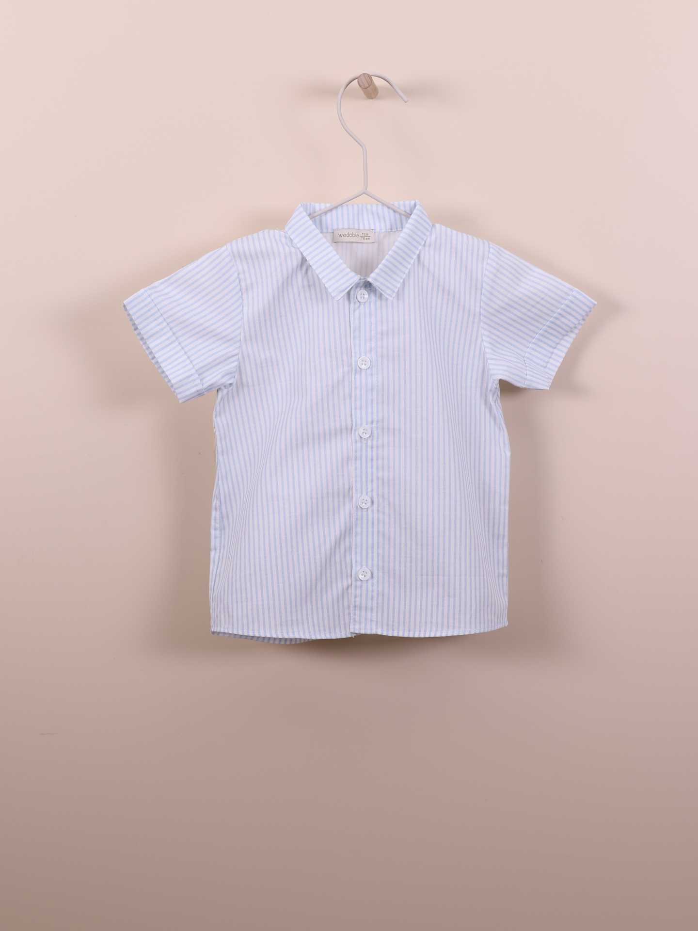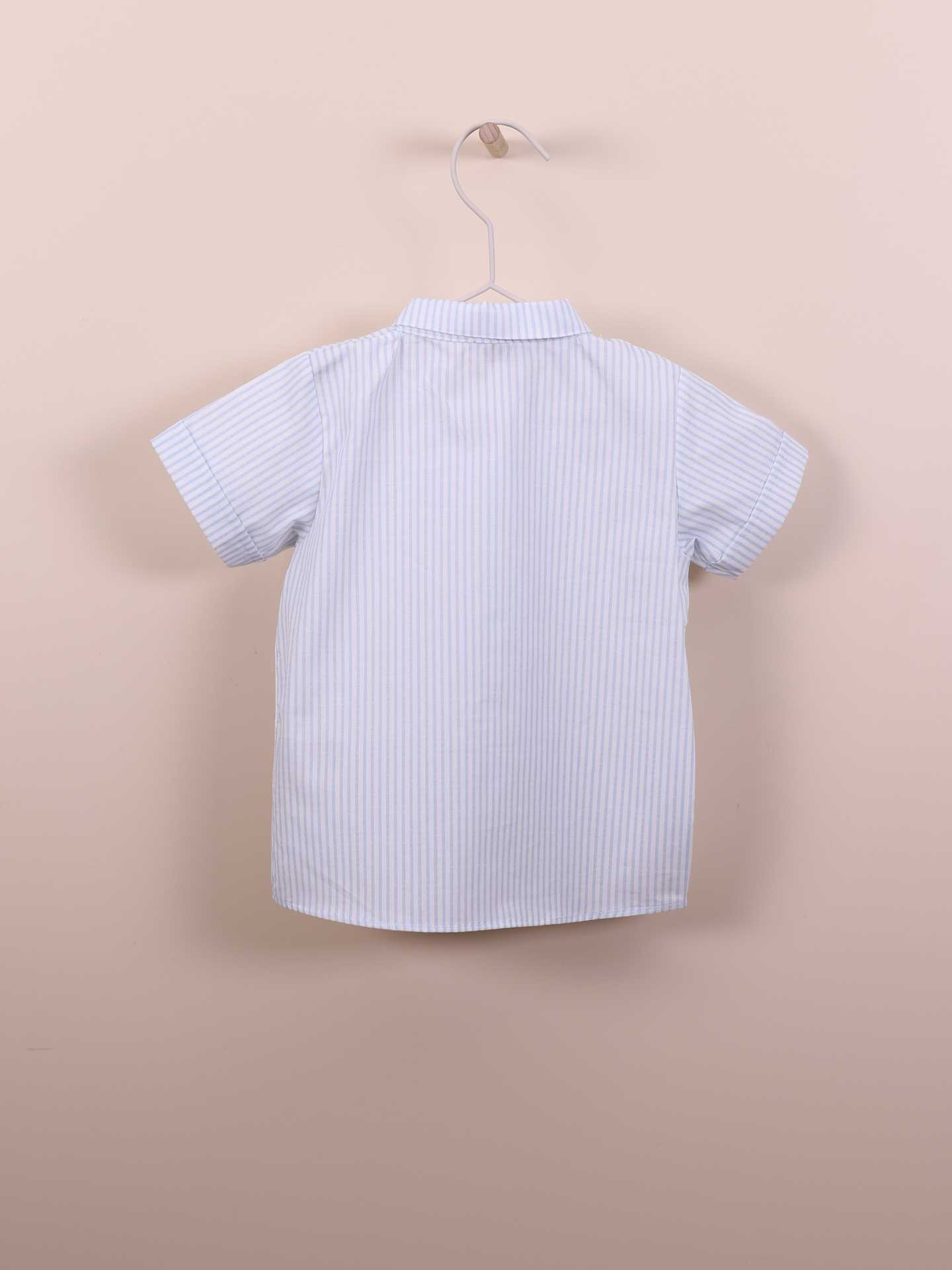 Camisa charmosa de manga curta ideal para bebés meninos, até aos 4 anos. A camisa GARDEN IN THE FOREST é produzida em tecido de algodão suave, com um elegante padrão com risca azul e fundo pérola. Aperta na frente com botões madre pérola.