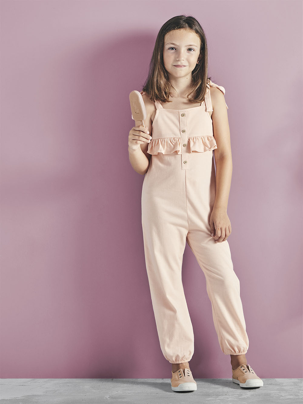 Coleção Funny, macacão com pormenor de folho frontal e botões em madeira.