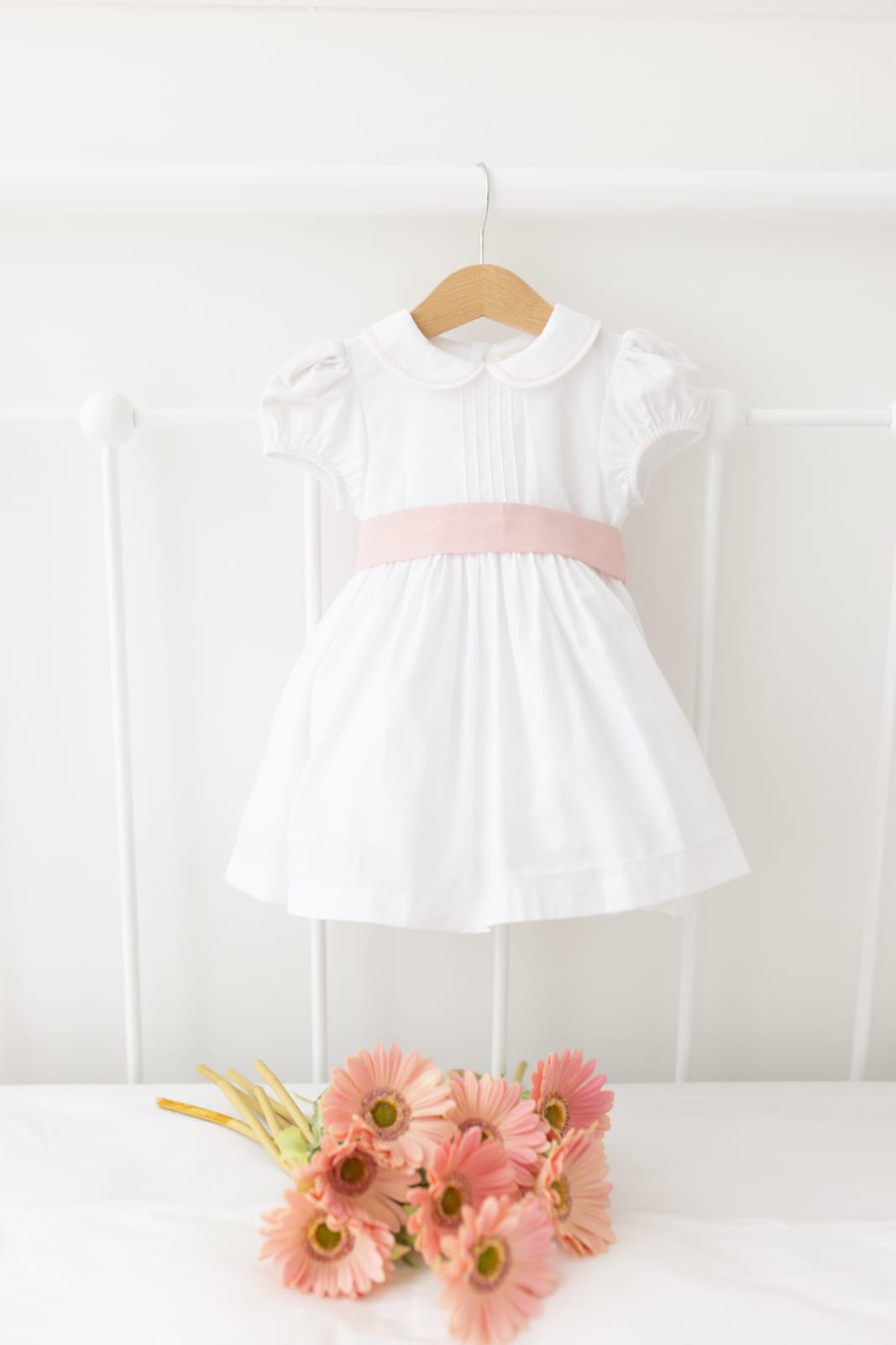 Delicado e elegante vestido de cerimónia Amelie. Uma peça produzida em tecido de algodão suave com uma delicada faixa removível em rosa nude, forrado em algodão leve. Aperta nas costas com botões madre pérola.