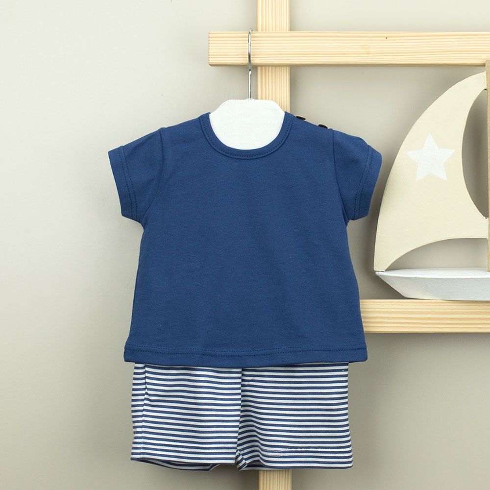 O conjunto Light Blue é composto por uma camisa e uns calções. Camisa de manga curta com gola redonda e botões em madeira. Calções com bolsos laterias e elásticos na cintura, permitindo o máximo conforto.