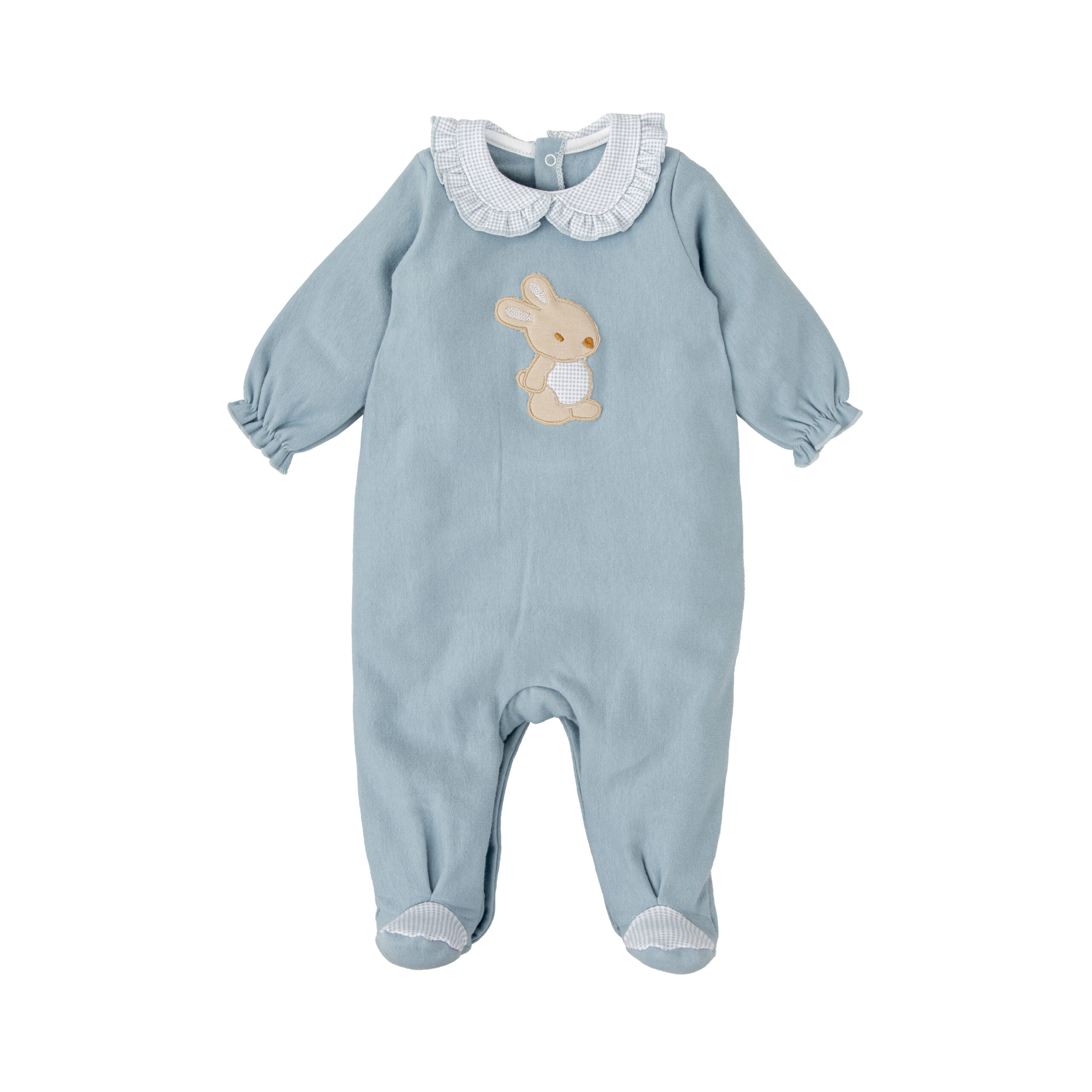 Babygrow Bunny cardado em azul-petróleo e aplique de coelhinho. Abertura nas costas e entre pernas com molas de pressão