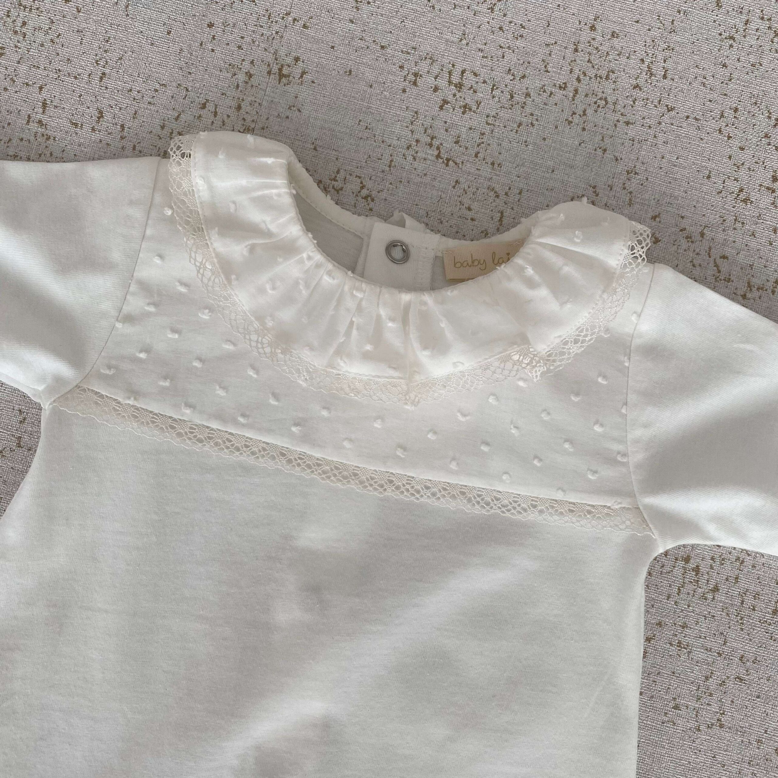 Body de manga curta ideal para bebé menina. Body manga curta branco é produzido em malha de algodão leve, com uma gola bordada com folho em tecido. Aperta nas costas e entre as pernas com molas. Bordado disponível em várias cores.