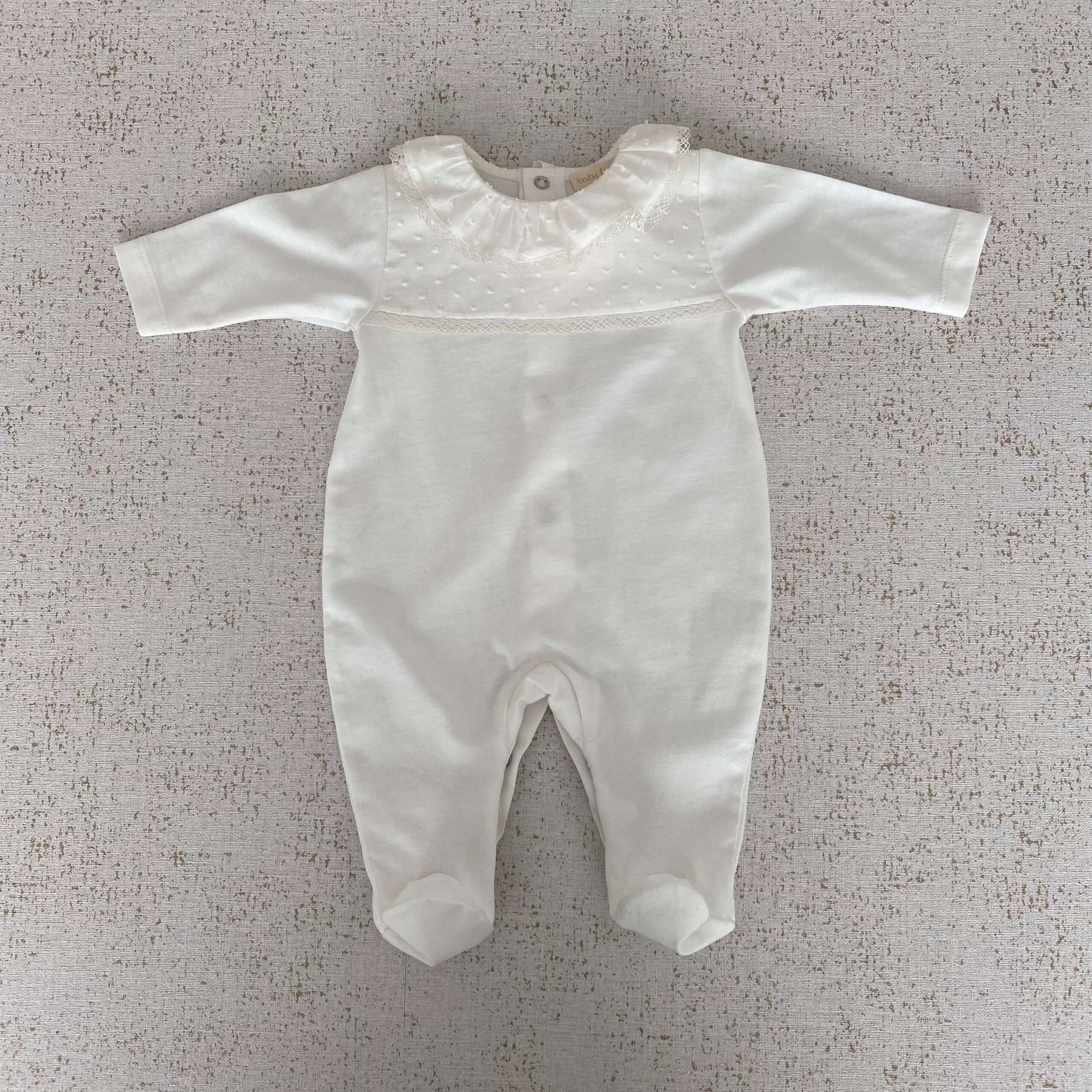 | Babygrow em algodão suave. Manga comprida com golinha e folho. Abertura entre pernas e nas costas com molas de pressão.