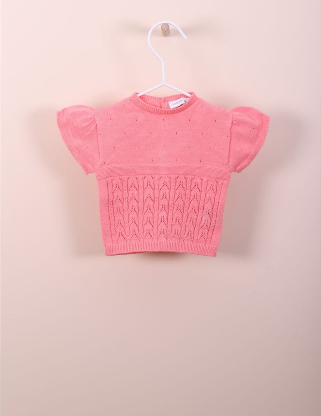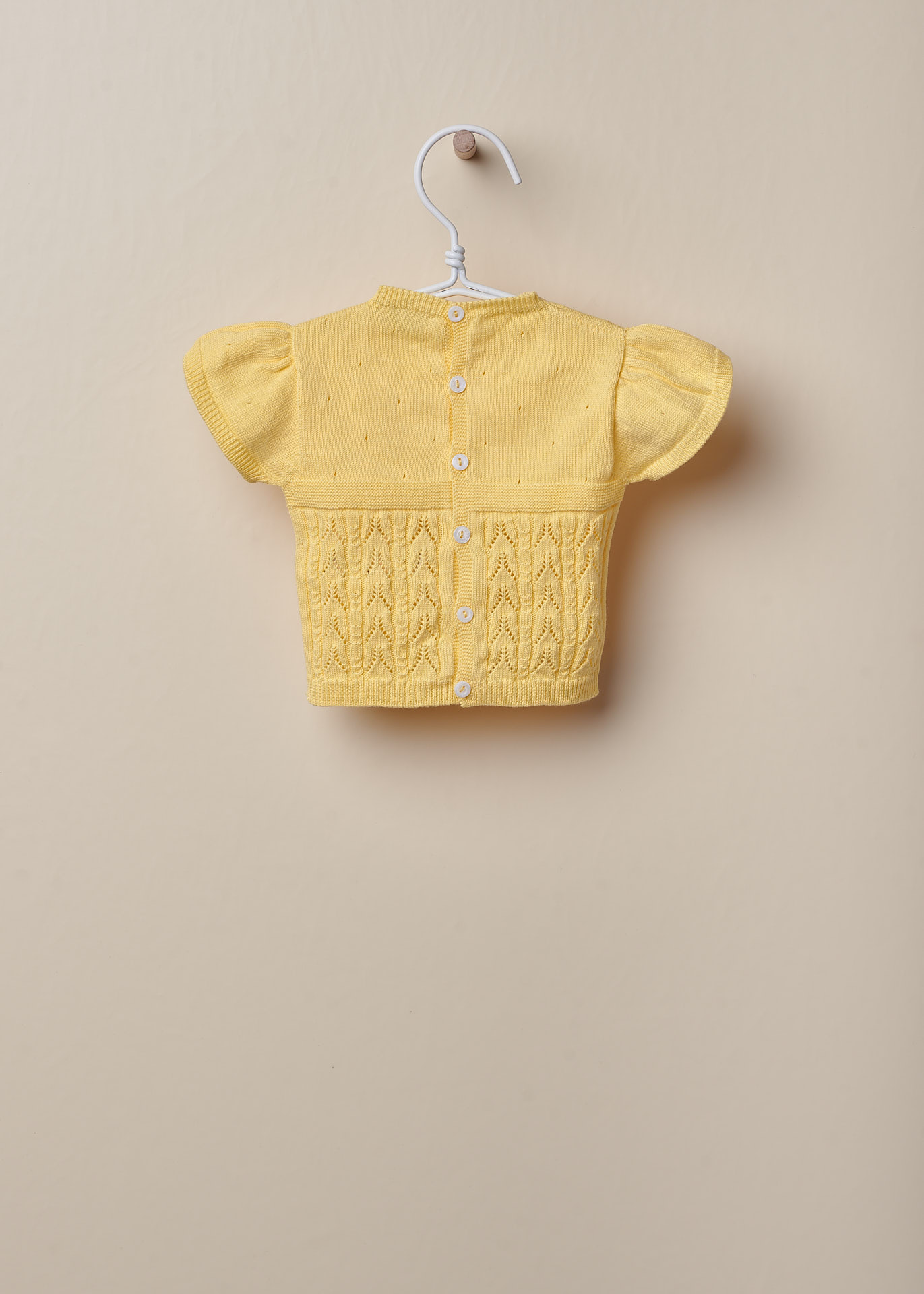 Camisola manga curta tricotada em malha fina de algodão suave . A camisola de manga curta SUMMER GLOW aperta nas costas com botões madre pérola. Produzido em Wholegarment, uma peça completa sem costuras, para maior conforto do seu bebé.