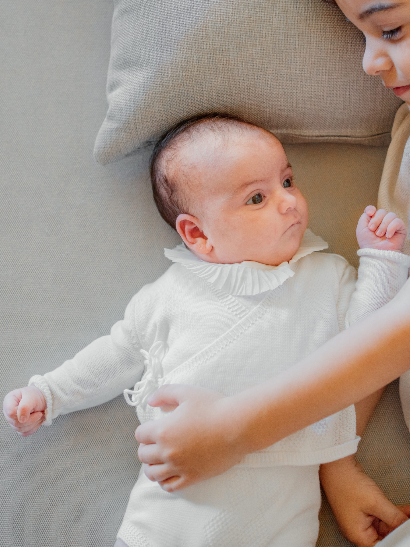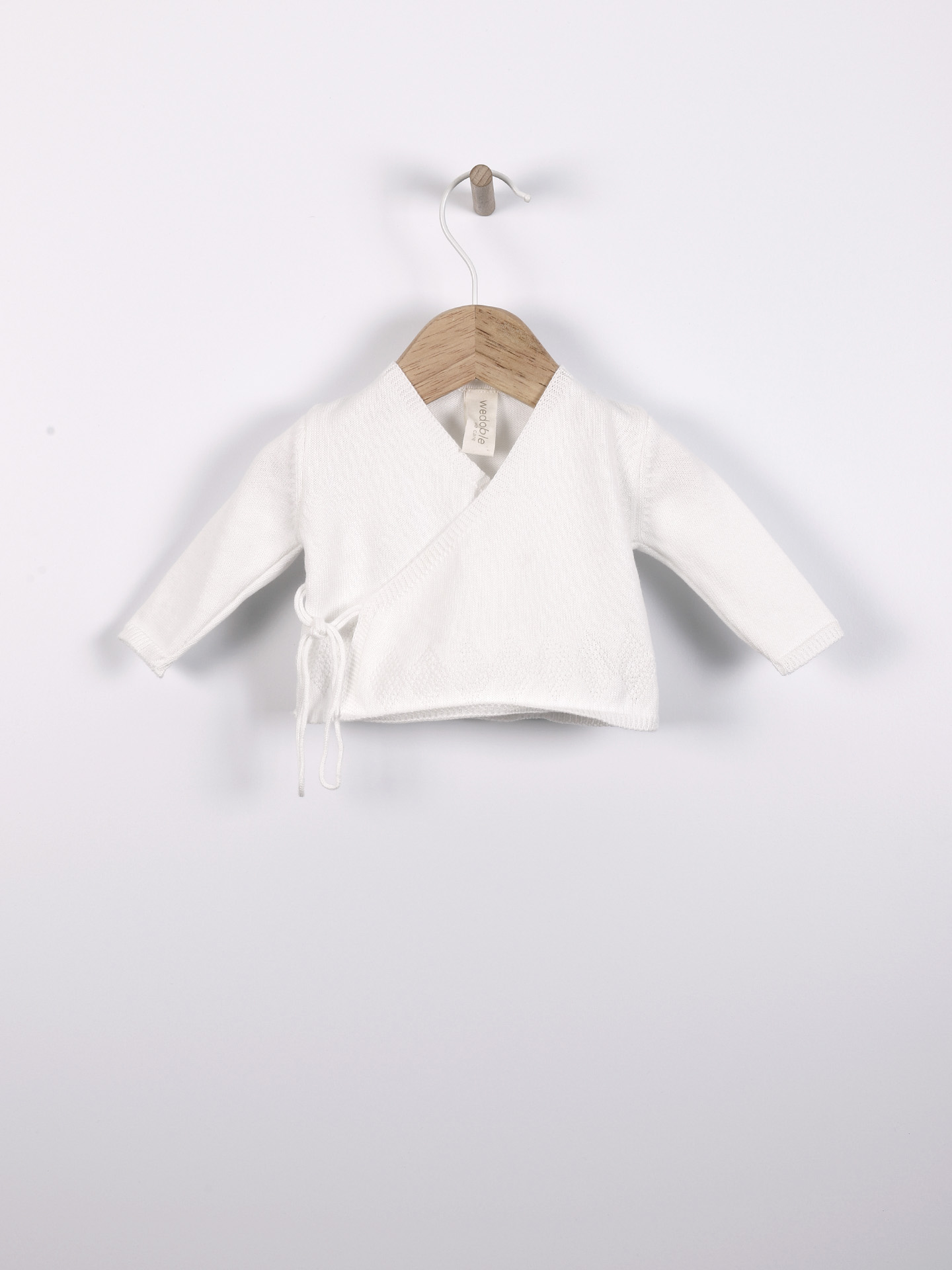Casaco de manga comprida tricotado em malha fina de algodão orgânico, suave e respirável,O casaco BABY LOVE aperta na frente em trespasse com um botão madrepérola no interior e um laço no exterior.