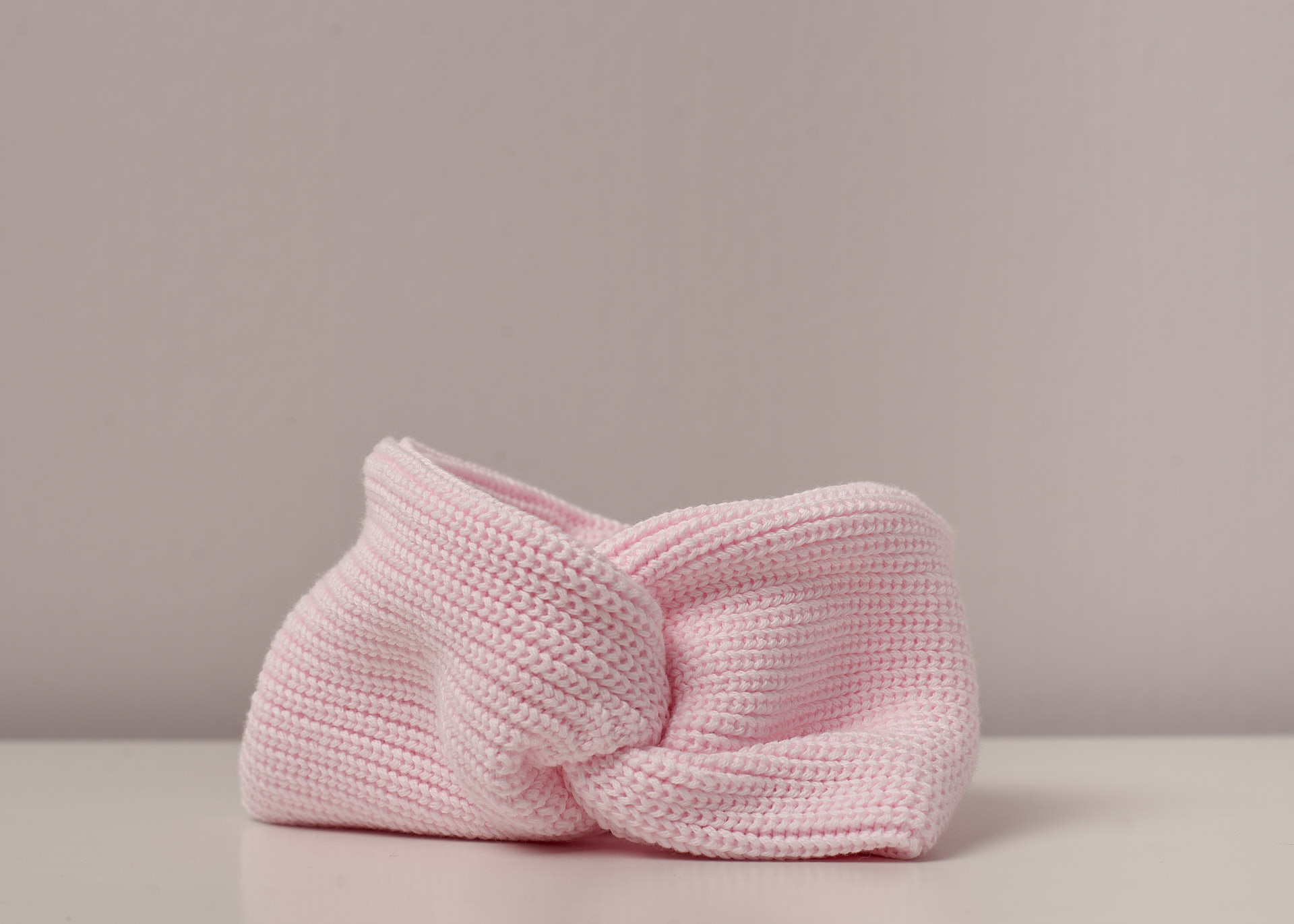 | Fita de cabelo larga tricotada em malha de algodão suave, ideal para bebés , até aos 4 anos. Um toque único com o efeito laço no topo.