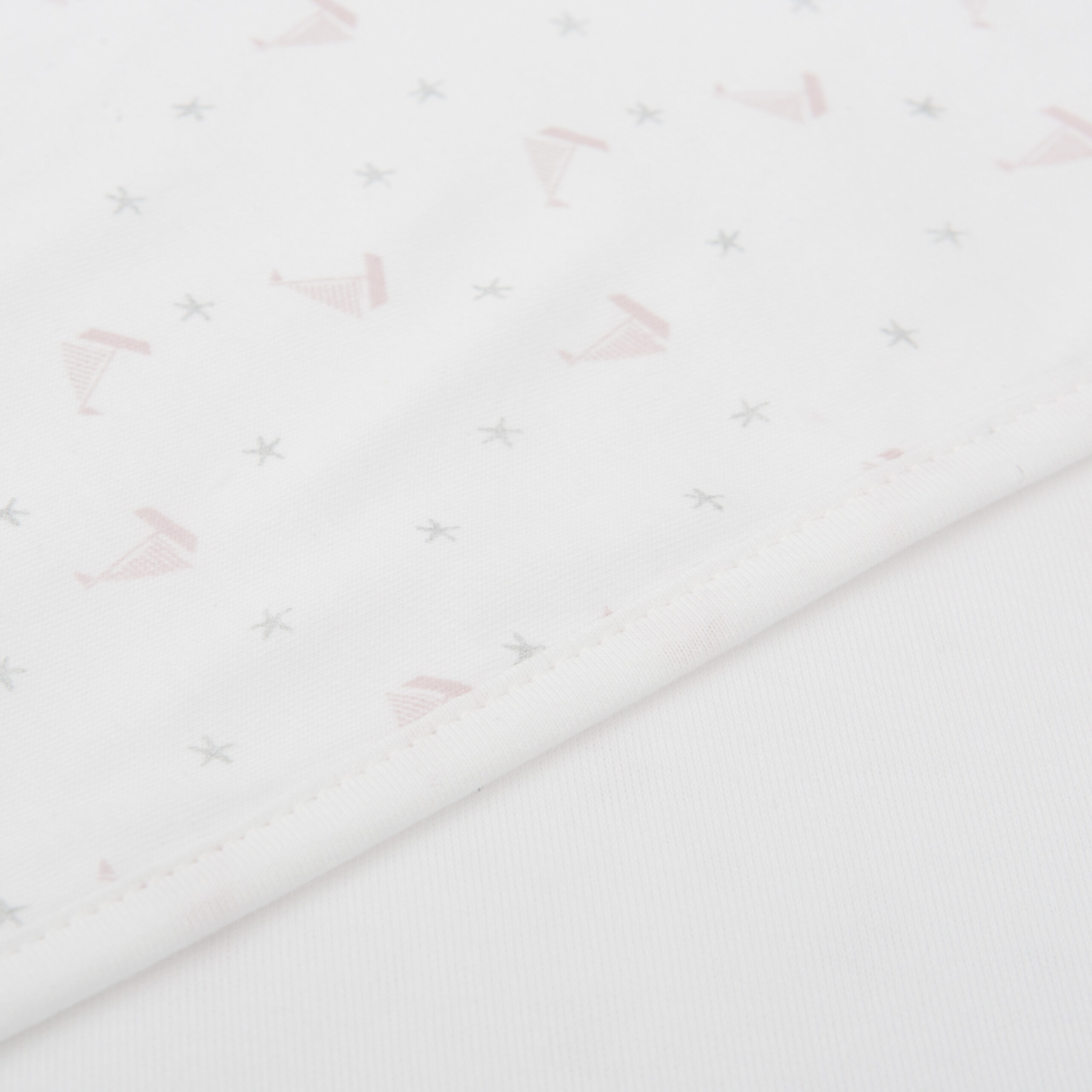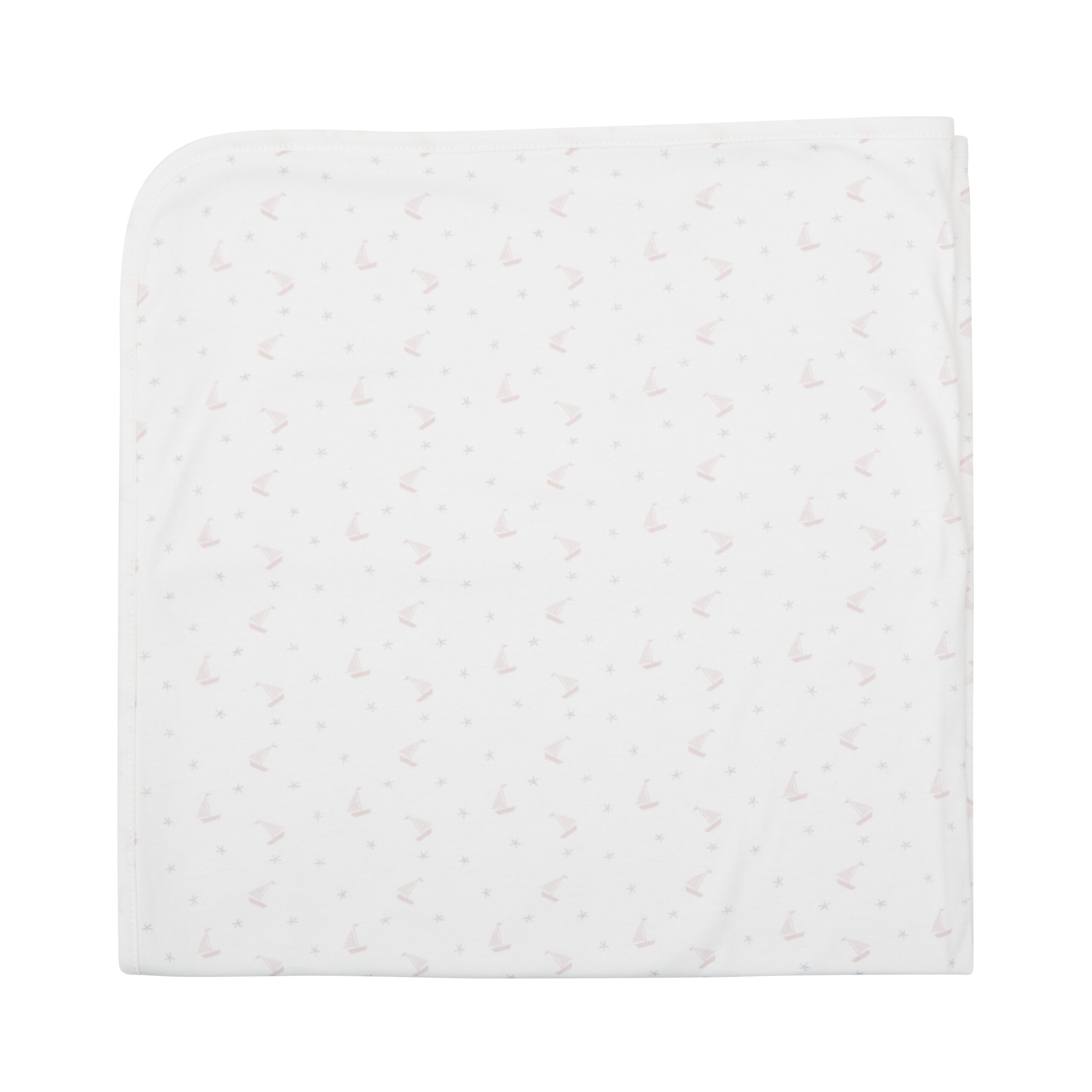 Manta em algodão dupla face com estampando de pequenos dhows . Perfeito para usar no berço e para envolver o bebé nos braços. Medias 78×78