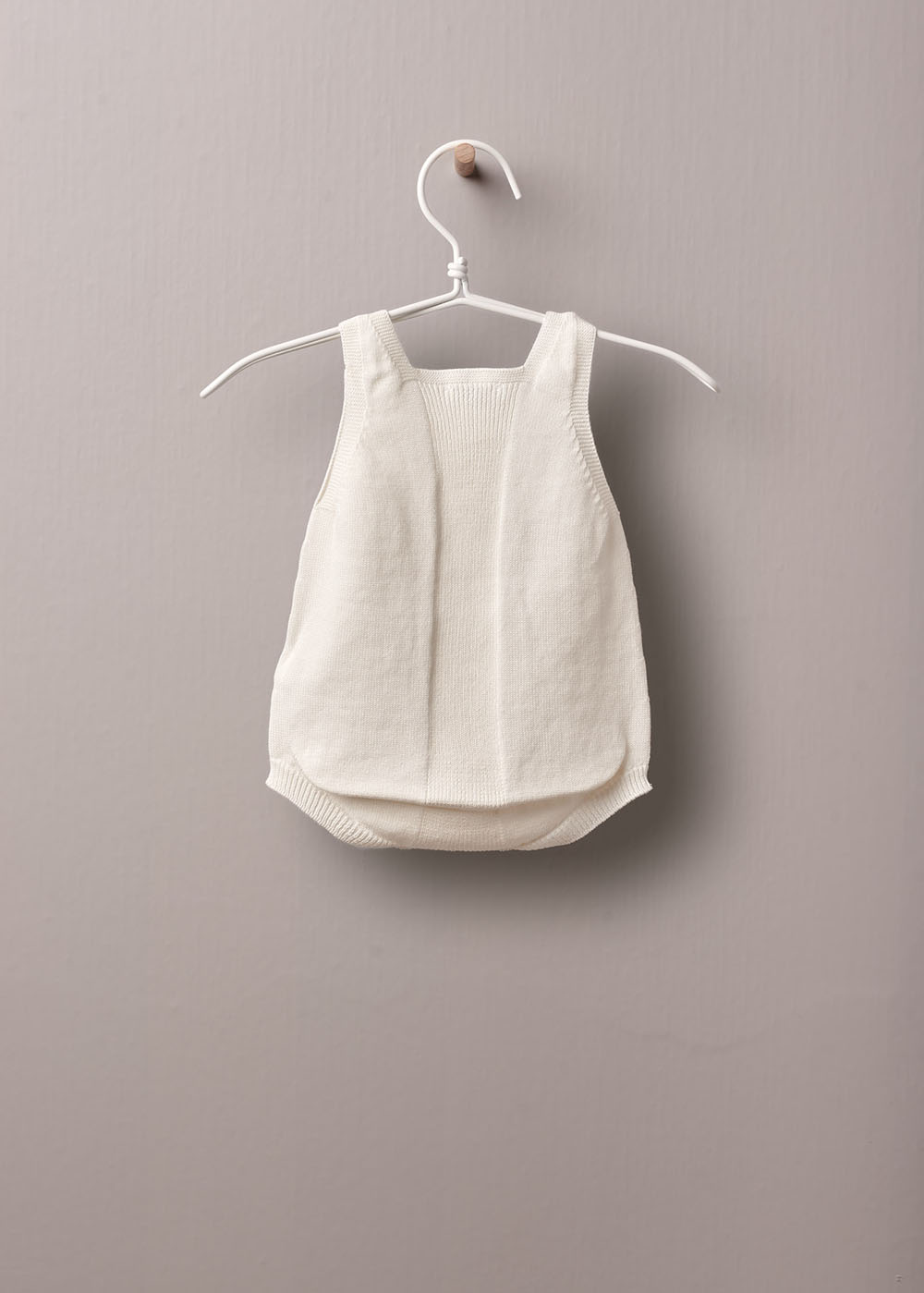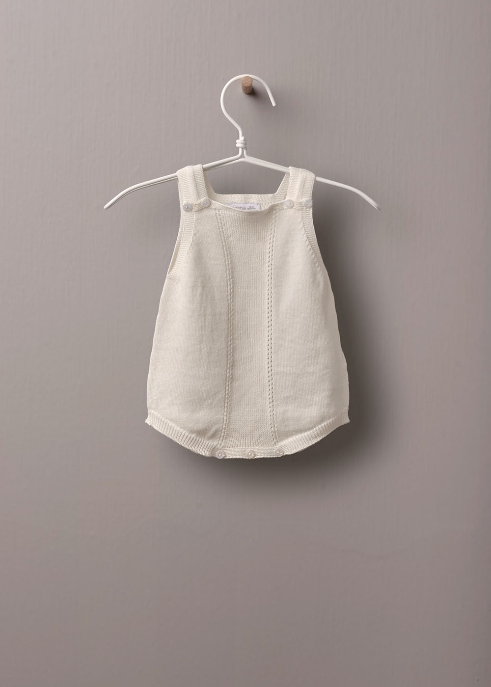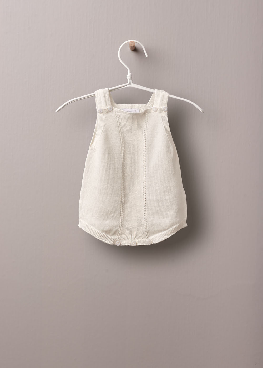 Fofo de alças em algodão orgânico, aperta na parte da frente, nas alças e entre pernas com botões madre pérola. Peça completa sem costuras, para maior conforto do bebé.