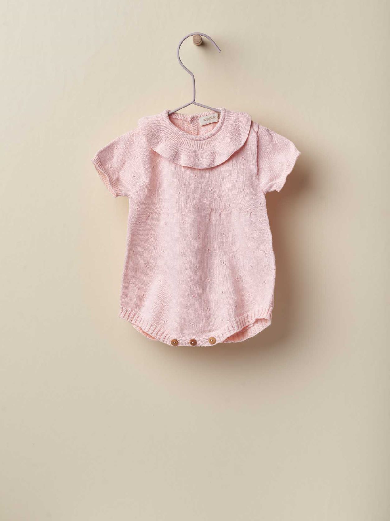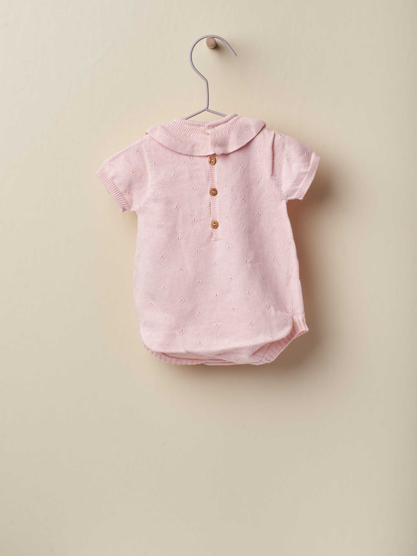 Fofo de manga curta tricotado em malha fina de algodão suave, O fofo de manga curta, com folho tricotado na gola, aperta nas costas e entre as pernas com botões de madeira. Produzido em Wholegarment, uma peça completa sem costuras, para maior conforto do seu bebé.