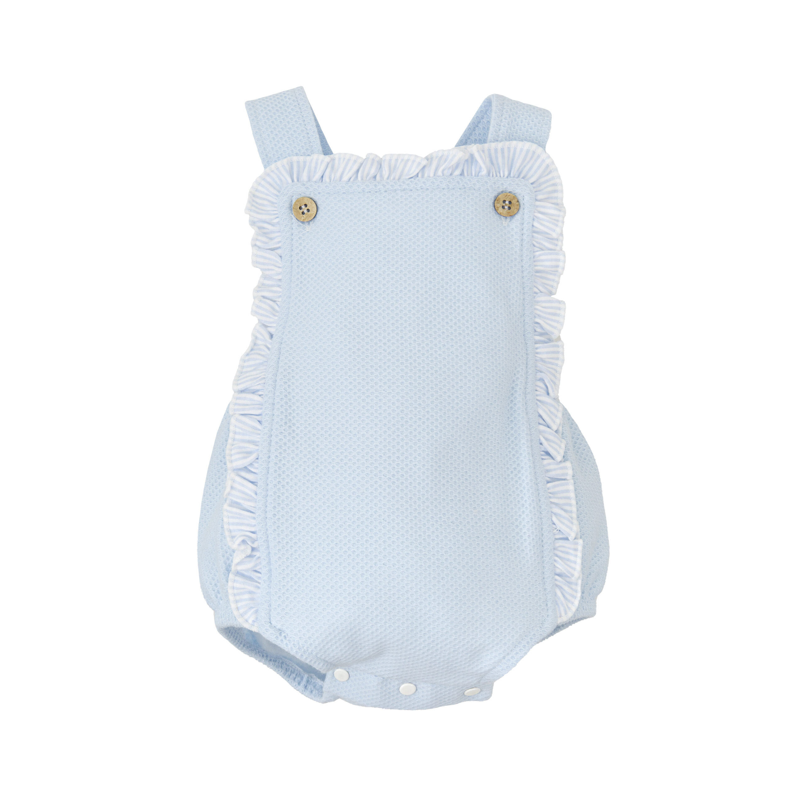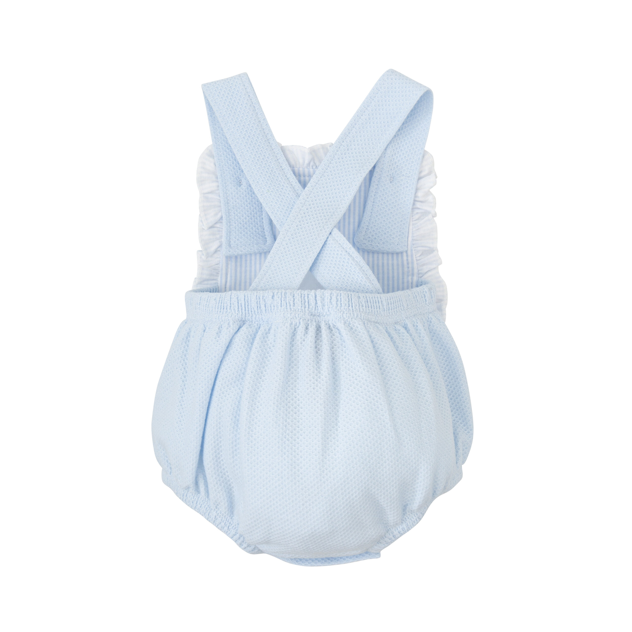 Fofo de alças em tecido Piquet  com detalhe frontal de pequeno folho As alças cruzam atrás e apertam no peito com botões de massa brancos. Tem molas no entrepernas, simplificando o momento de trocar a fralda, elástico dos lados e nas costas.