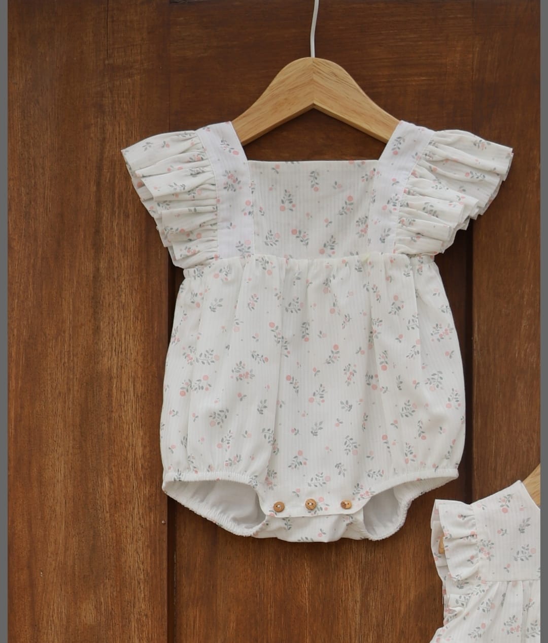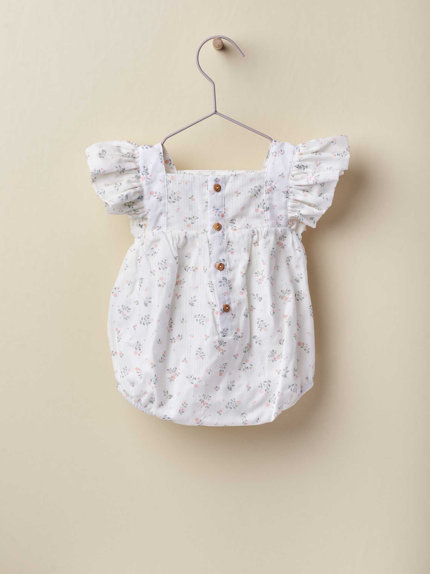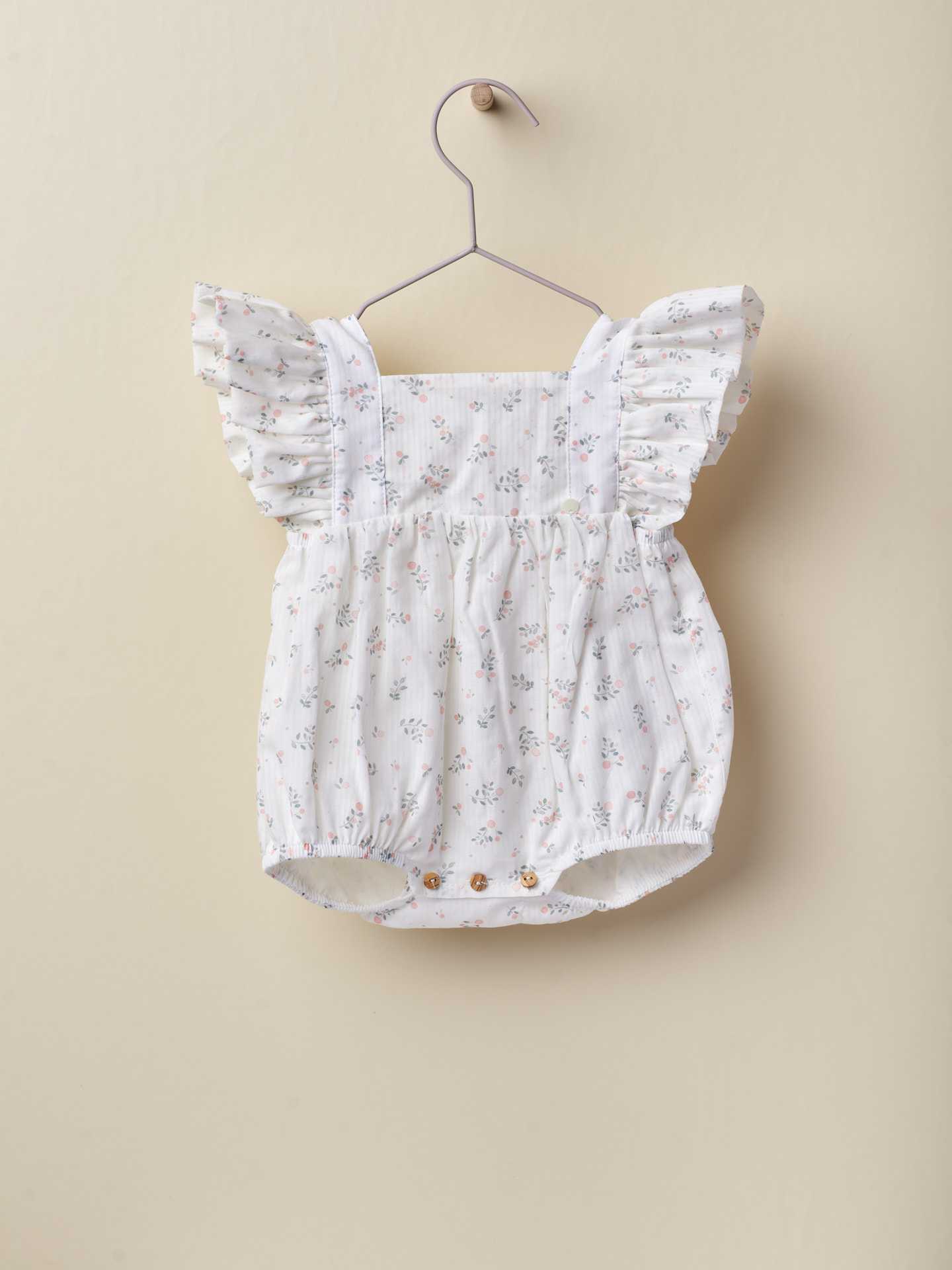 Fofo com papoilas . O fofo Little Love é produzido em tecido de algodão suave com um delicado estampado de papoilas rosas e verdes, com fundo pérola, Detalhe nos ombros com folhos  Forrado em algodão leve para maior conforto. Aperta nas costas e entre as pernas com botões de madeira.