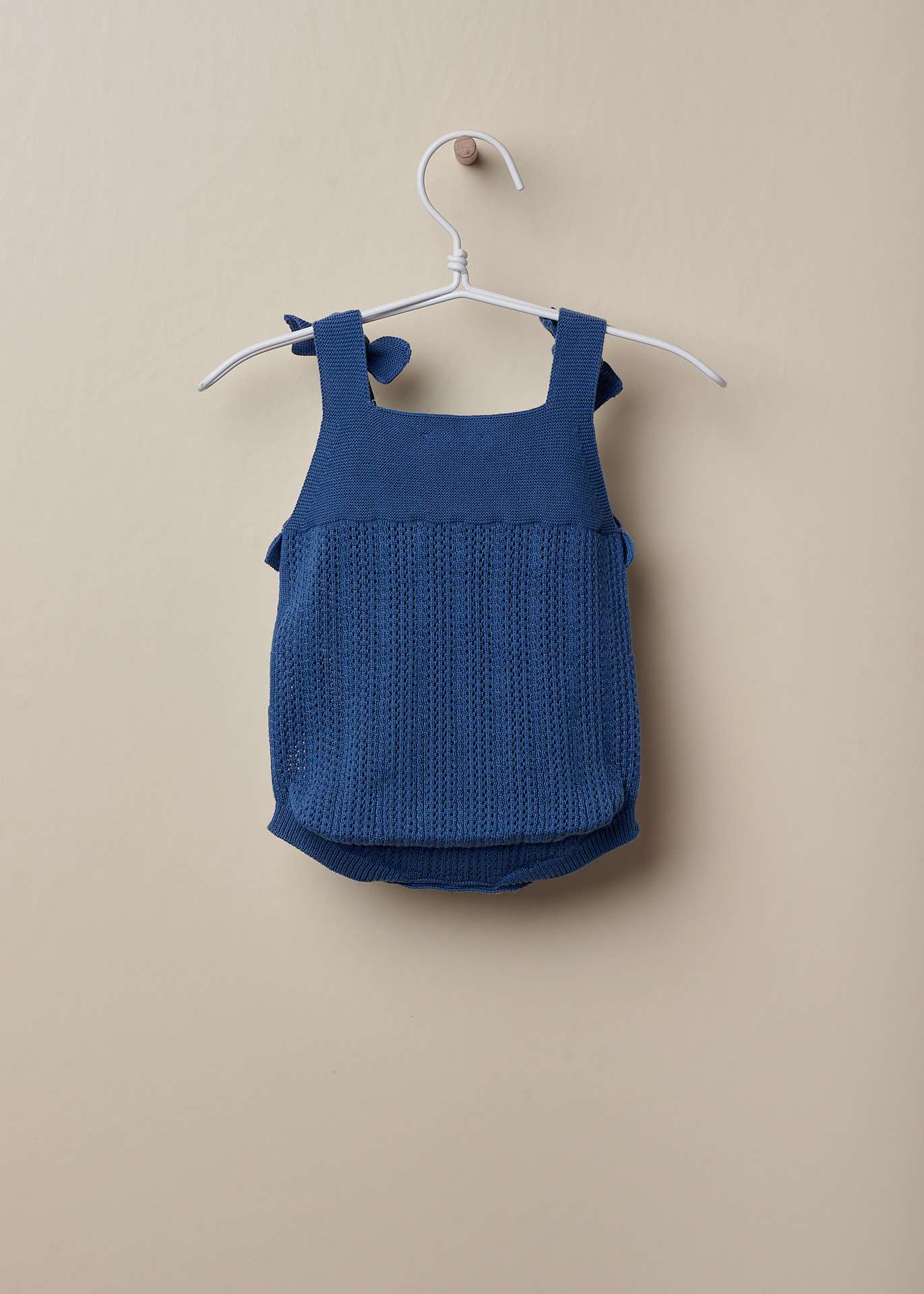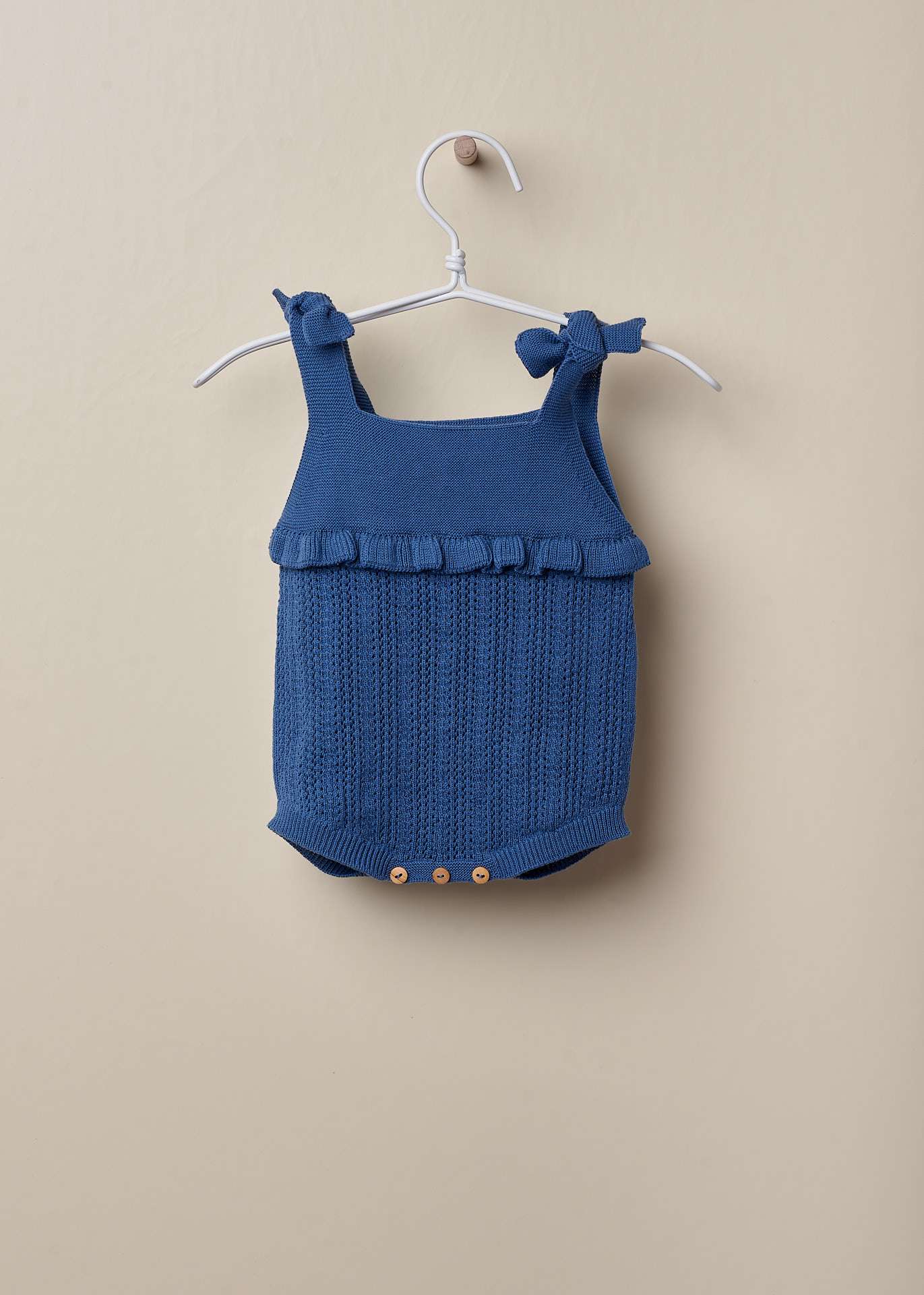 Fofo de alças tricotado em malha fina de algodão suave, ideal para bebés. O fofo com folho SWEET aperta nas alças com laço e entre as pernas com botões de madeira. Produzido em Wholegarment, uma peça completa sem costuras, para maior conforto do seu bebé.