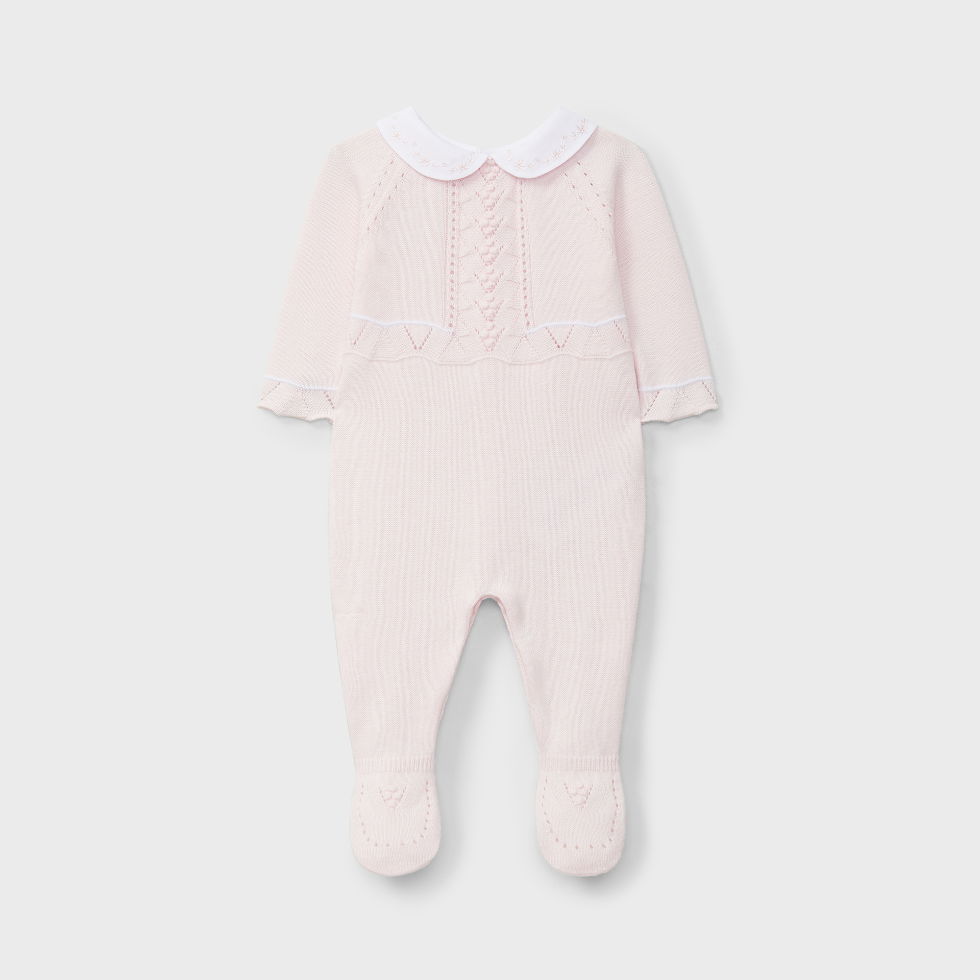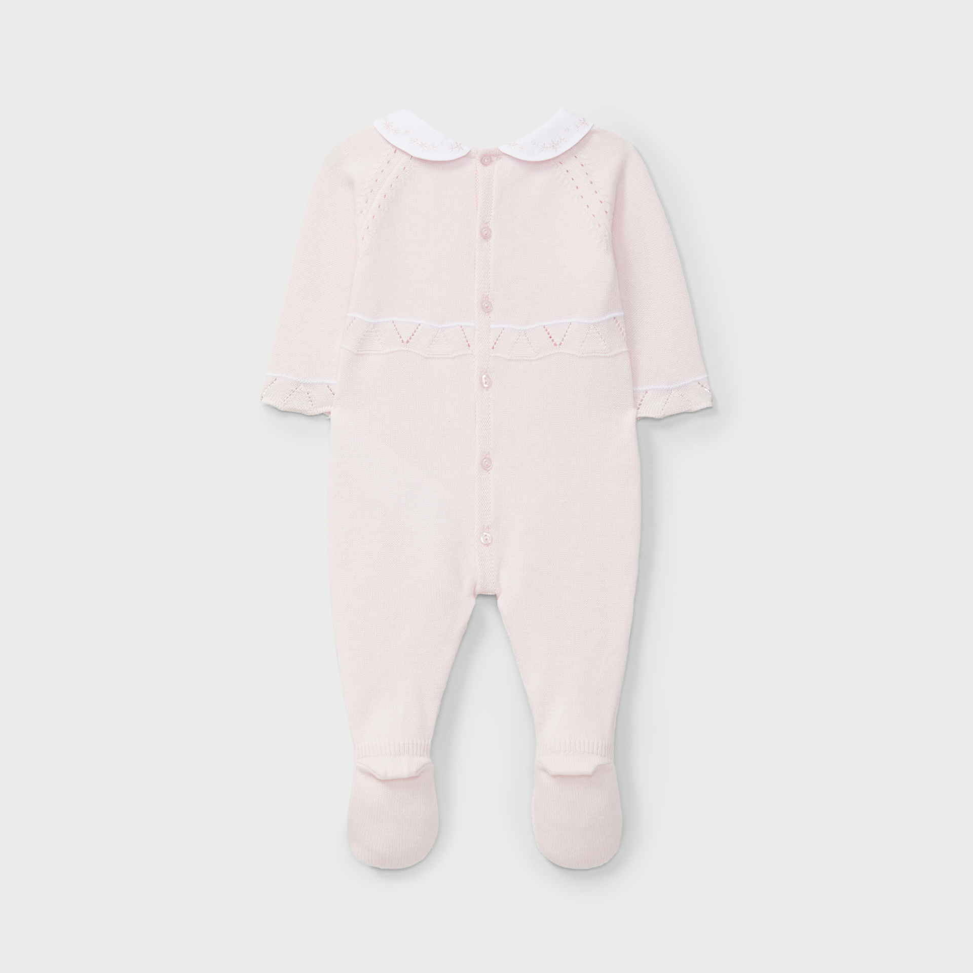 Babygrow de manga comprida com gola redonda bordada .O babygrow SWEET BABY GIRL é tricotado em malha fina de algodão orgânico aperta nas costas com botões madrepérola e entre as pernas com molas.
