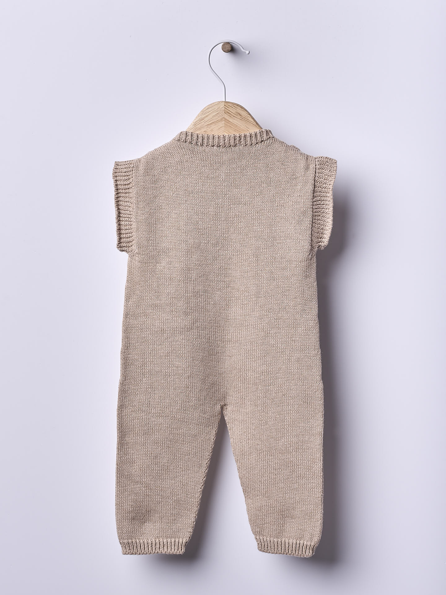 Macacão tricotado em malha de algodão orgânico suave e respirável O macacão SUMMER IN THE VILLAGE aperta na frente com botões de madeira. Produzido em Wholegarment, uma peça completa sem costuras, para maior conforto do seu bebé.