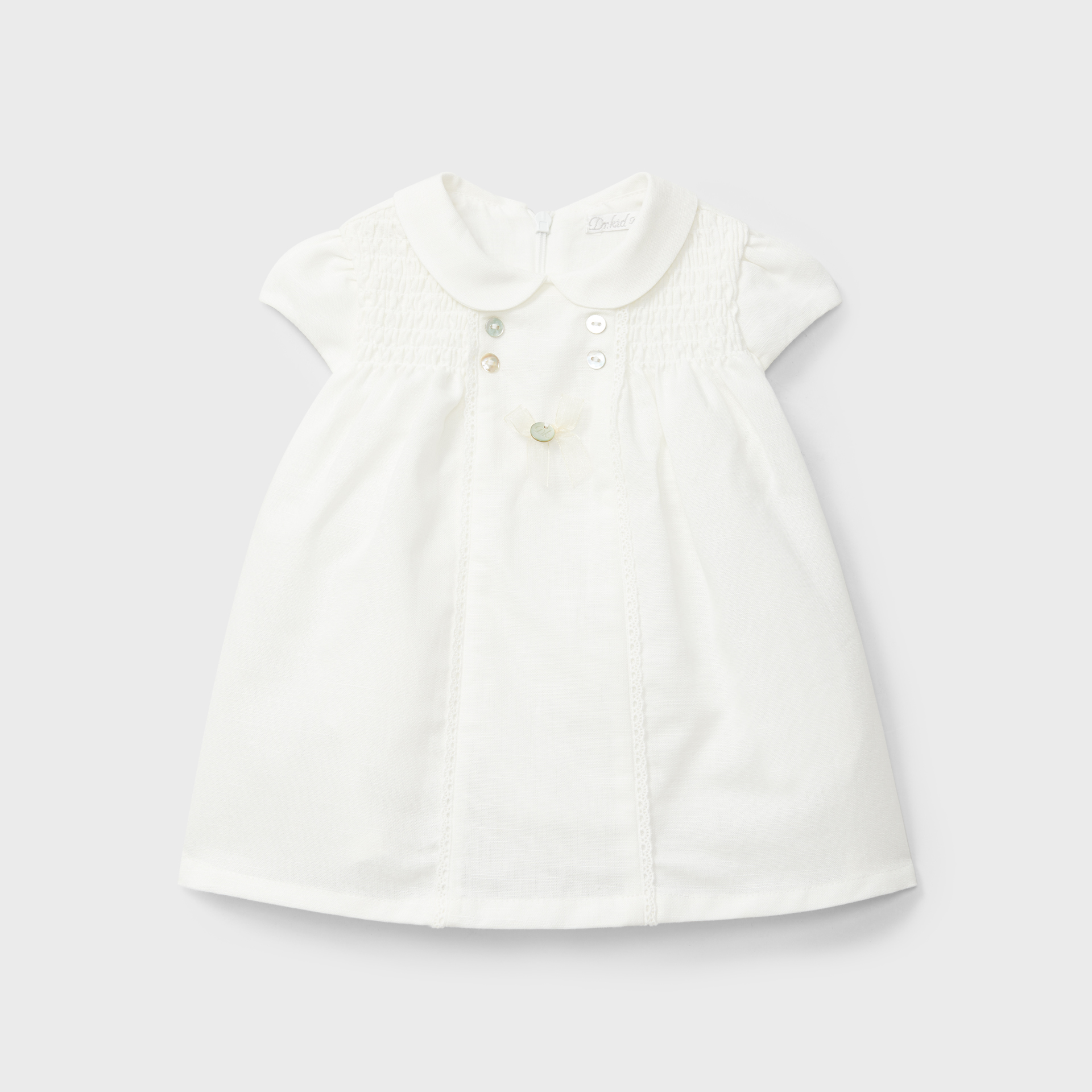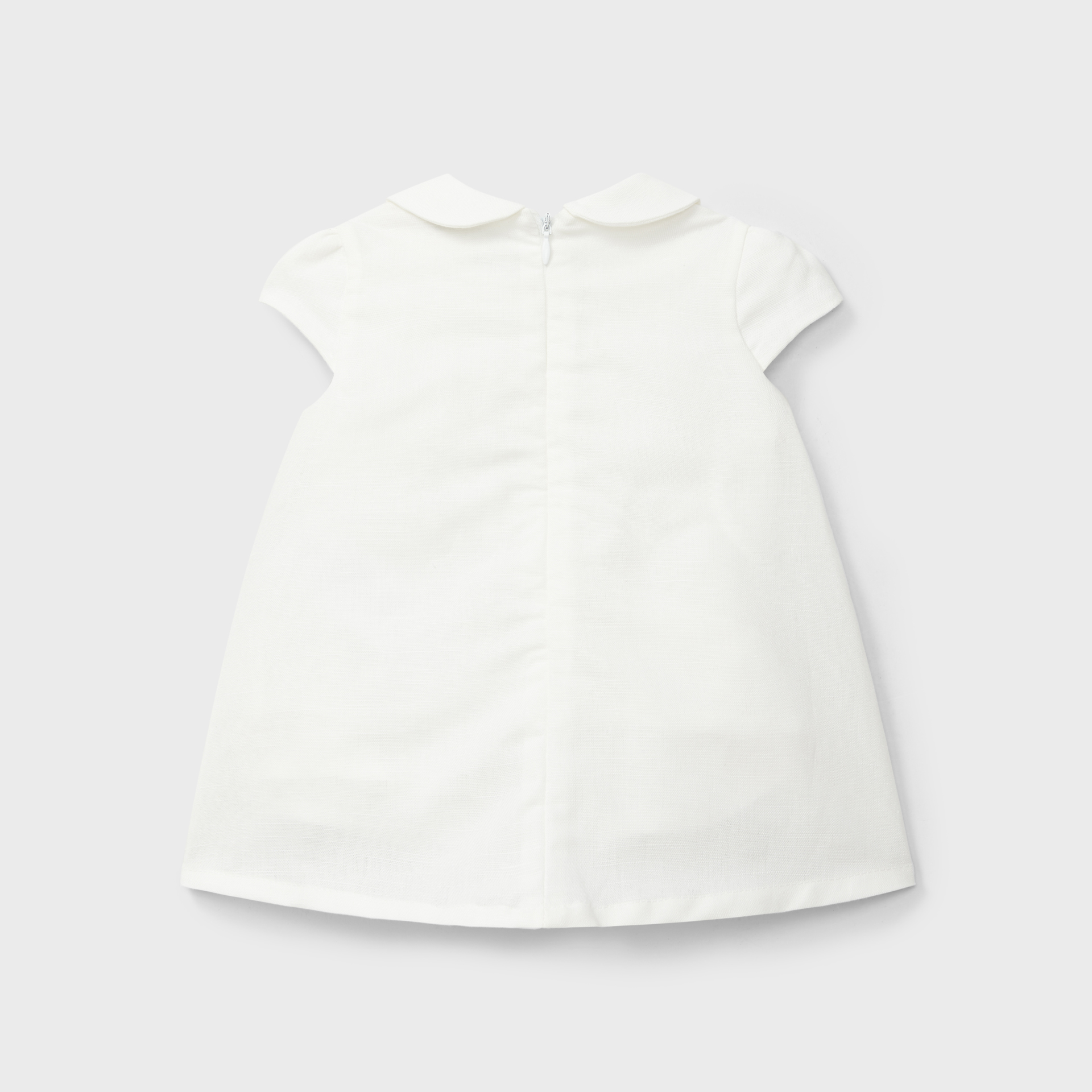 Coleção Patuco. Vestido com tapa fraldas em piquet, gola redonda, manguinha a cava com folhinho e pormenor frontal em ajur. Abertura nas costas com molas de pressão.