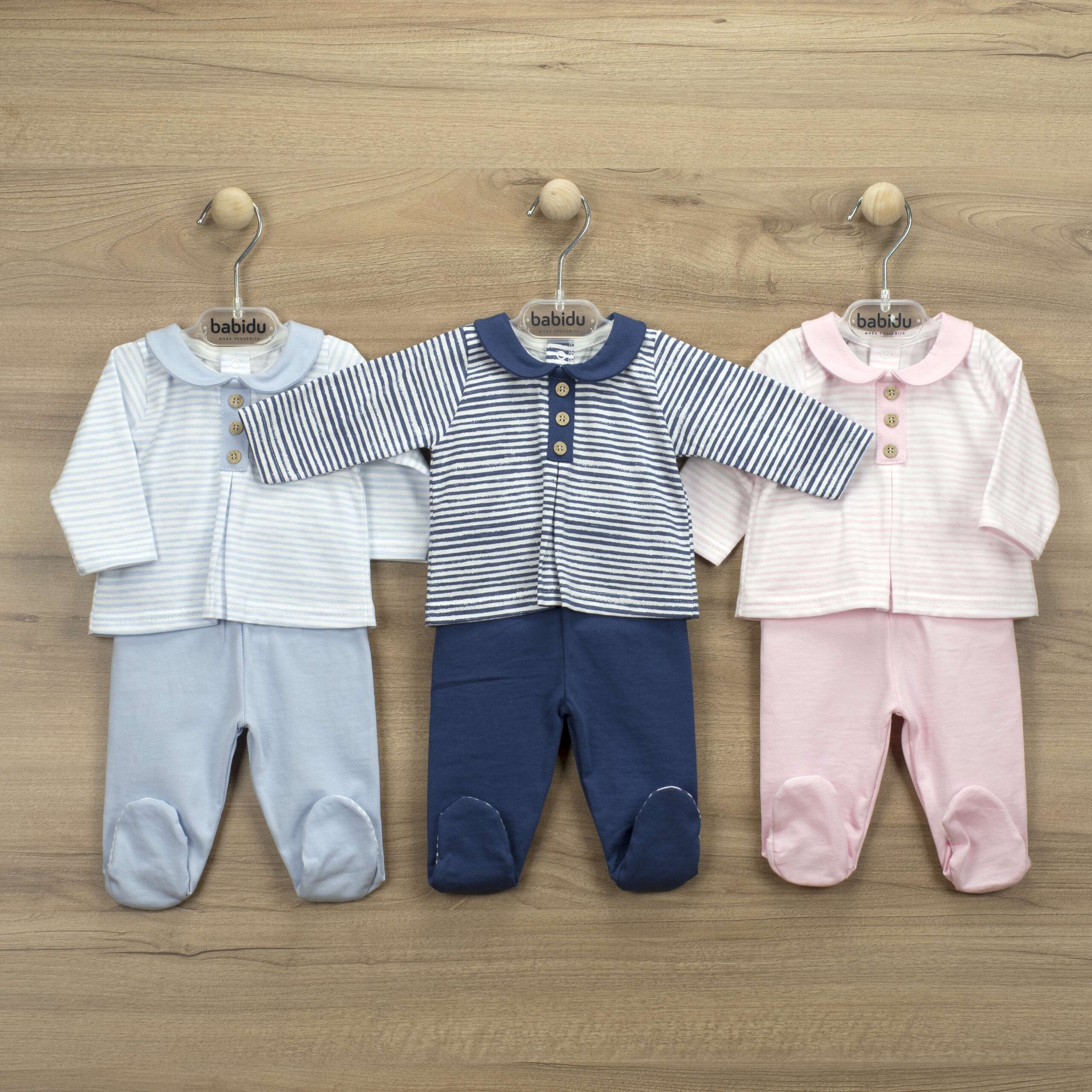 Coleção Cruiser . Conjunto composto por duas peças, camisola com gola e botões em madeira decorativos. Calças com pé Abertura nas costas com molas de pressão.