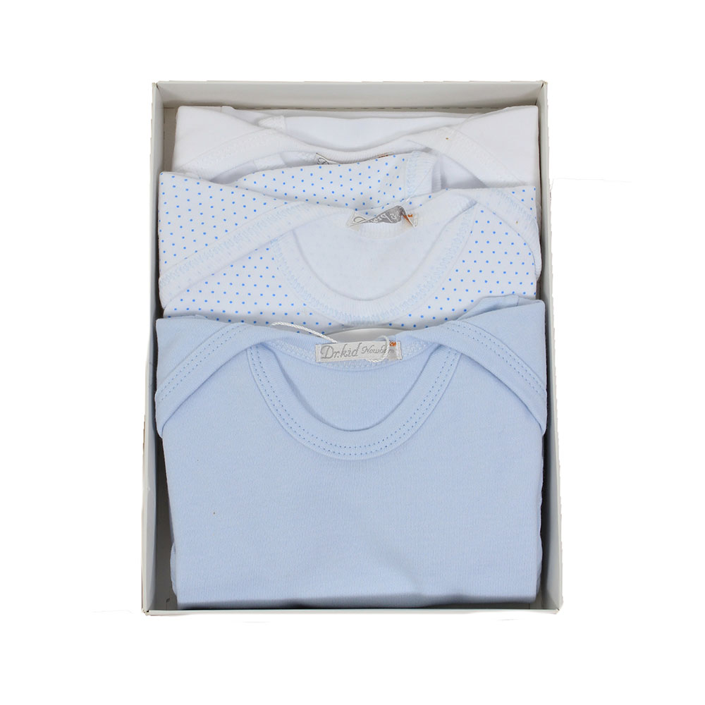 Pack composto por três bodies manga curta em três cores diferentes. Aperta com molas de pressão entre pernas