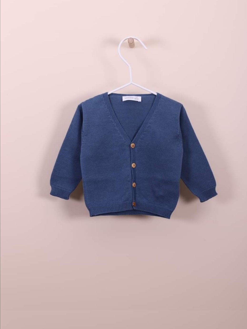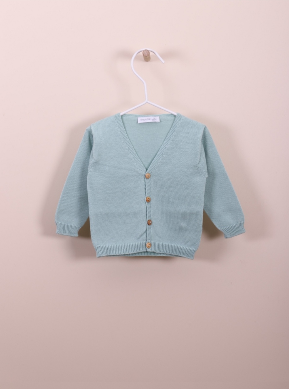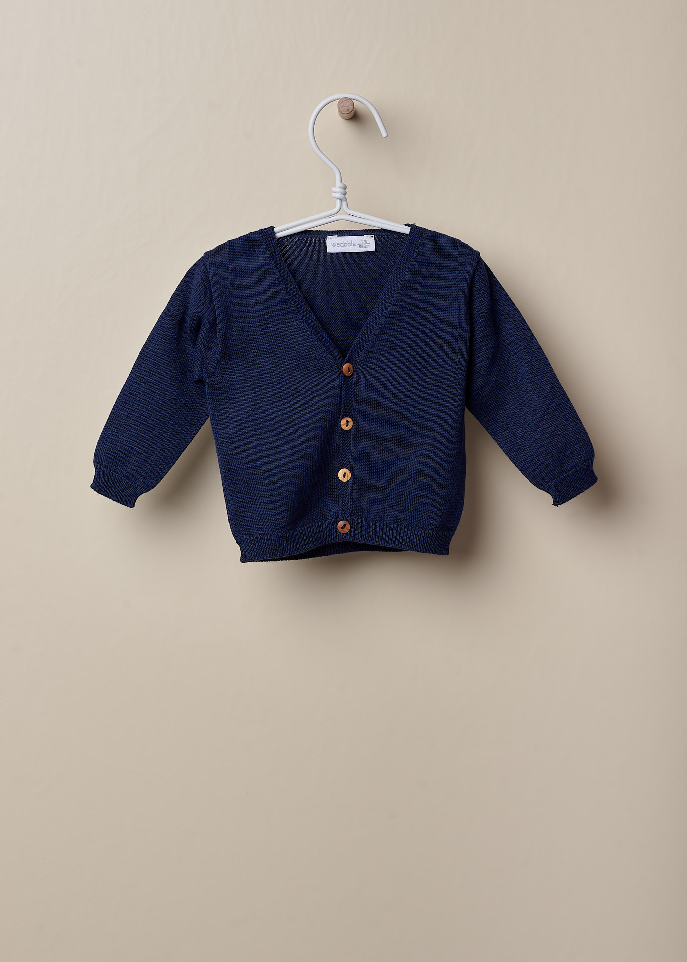 Casaco de manga comprida tricotado em malha de algodão suave, ideal para bebés meninos e meninas, até aos 4 anos. O casaco de malha com decote em V, aperta na frente com botões de madeira. Produzido em Wholegarment, uma peça completa sem costuras, para maior conforto do seu bebé.