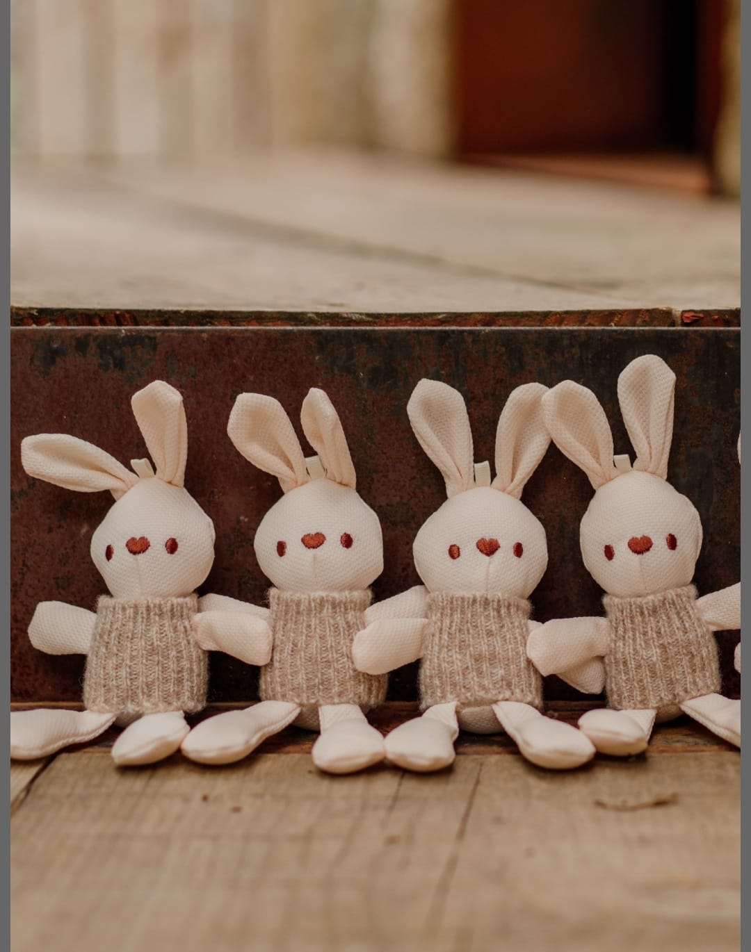 Coelhinho de peluche com camisola tricotada em malha suave de lã merino extrafina.Mais do que um simples brinquedo, este adorável peluche é um companheiro especial que proporciona alegria, conforto e cria memórias inesquecíveis ao lado do seu bebé. Com o seu design encantador e toque macio, este coelhinho será o amigo inseparável do seu pequeno, perfeito para abraços carinhosos e muito amor.