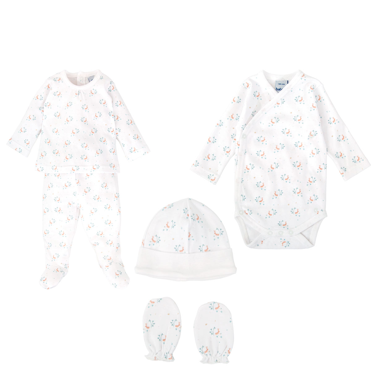 Pack de nascimento composto por body cruzado de manga comprida, uma camisola, calças com pé, gorro e luvas. Um lindo presente de cinco peças para dar as boas-vindas ao seu bebé recém-nascido.