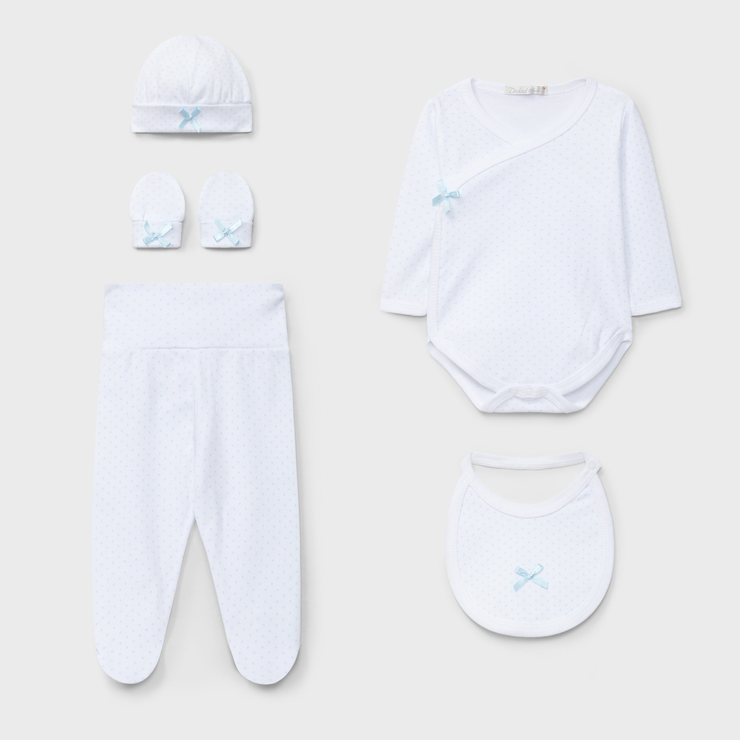 Pack de nascimento composto por um body cruzado, , calças com pé, gorro e luvas. Um lindo presente de cinco peças para dar as boas-vindas ao seu bebé recém-nascido.