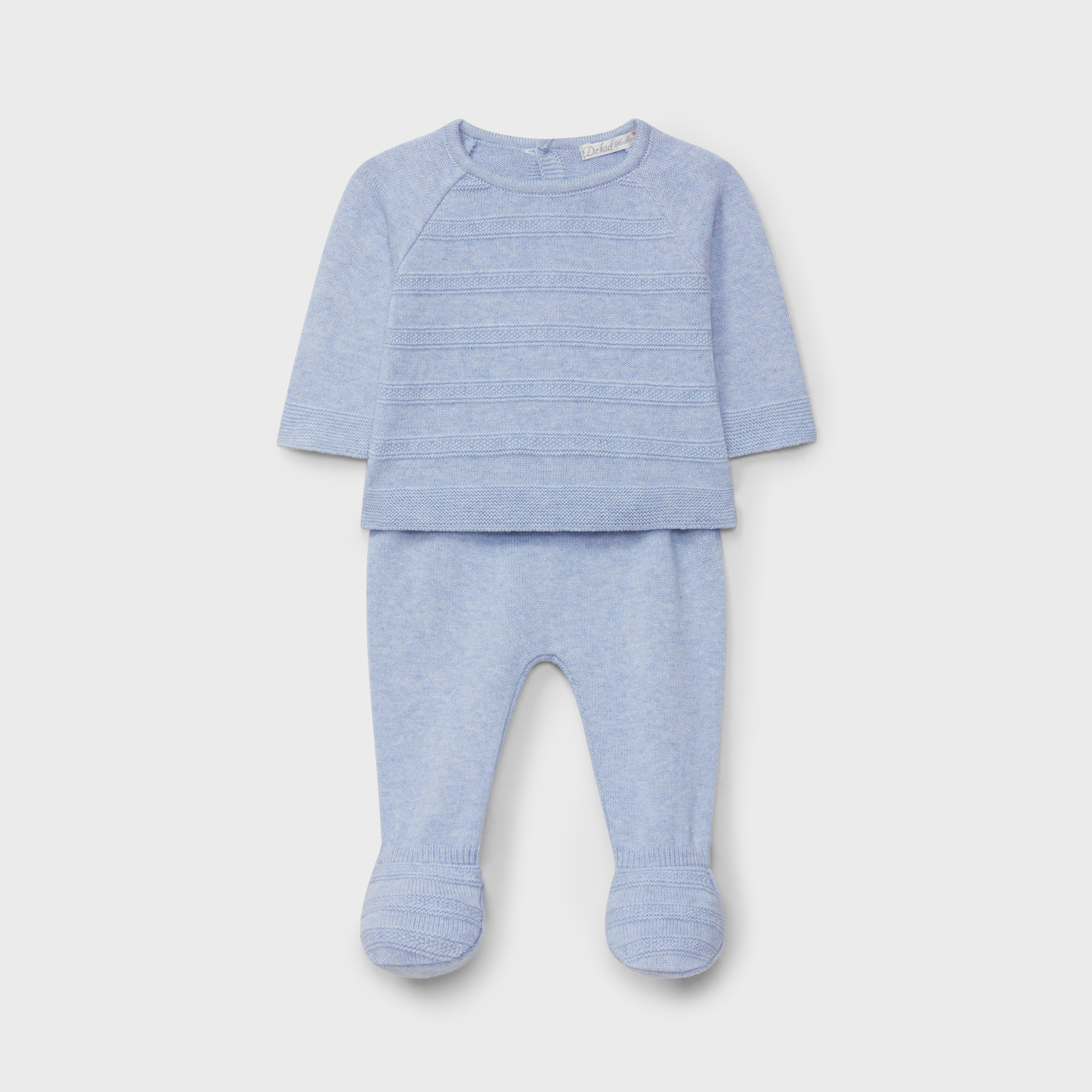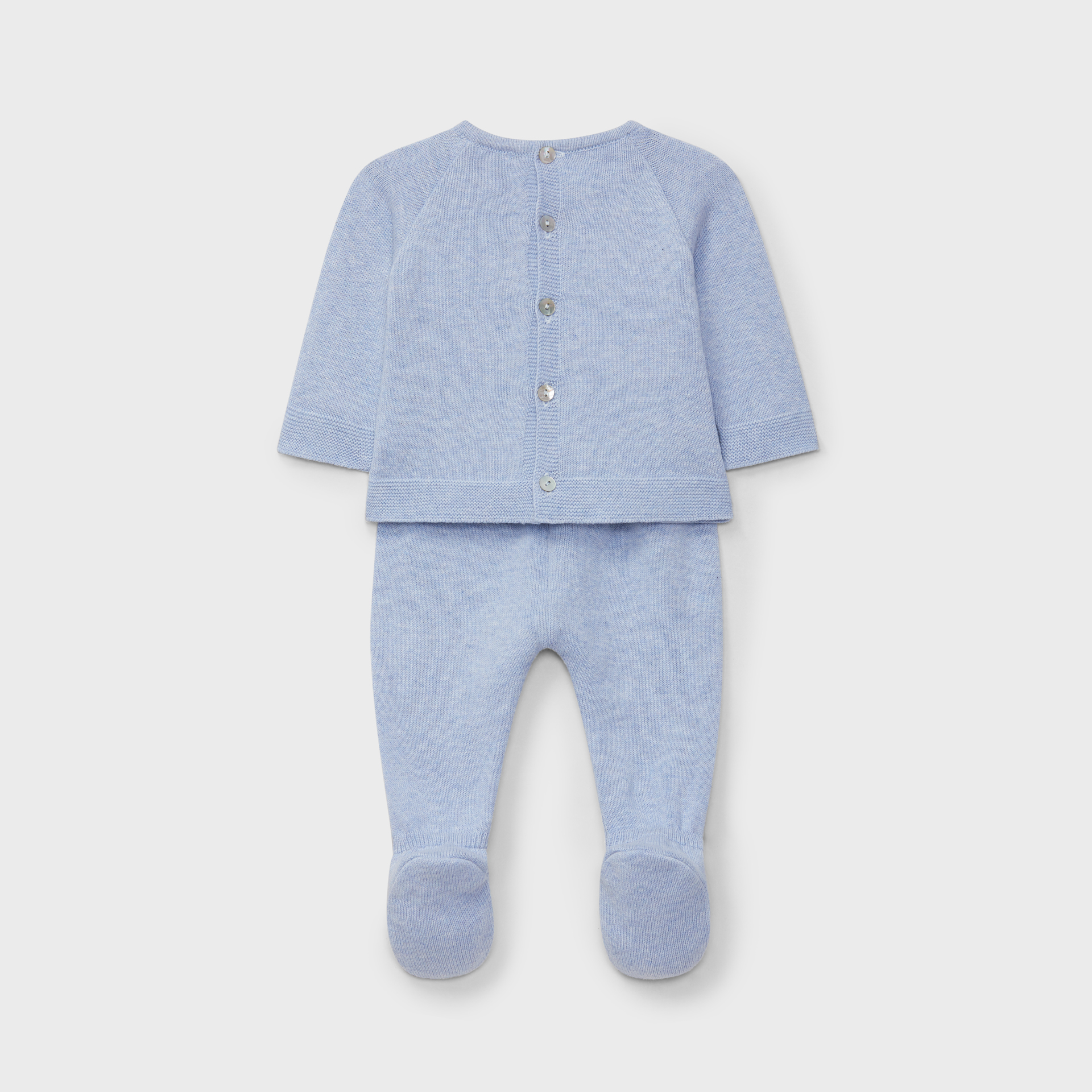 Conjunto composto com camisola de manga comprida e calças com pé, O Conjunto MUST HAVE é tricotado em malha fina de algodão, suave e respirável,
