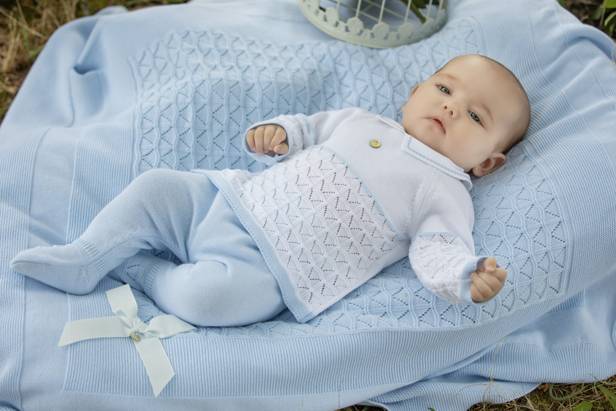 Conjunto composto com camisola de manga comprida e calças com pé. O Conjunto SWEET BABAY BOY é tricotado em malha fina de algodão, suave e respirável,