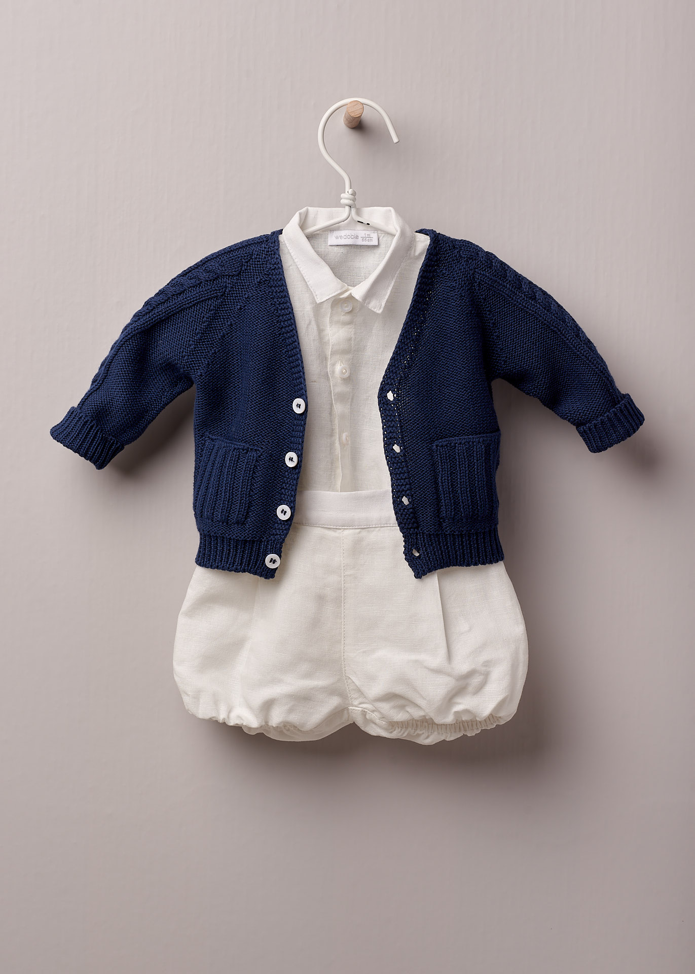 Casaco curto (Bolero) para bebé menina, em malha ponto jersey com efeito de espiga no ombro e botões madre pérola.
