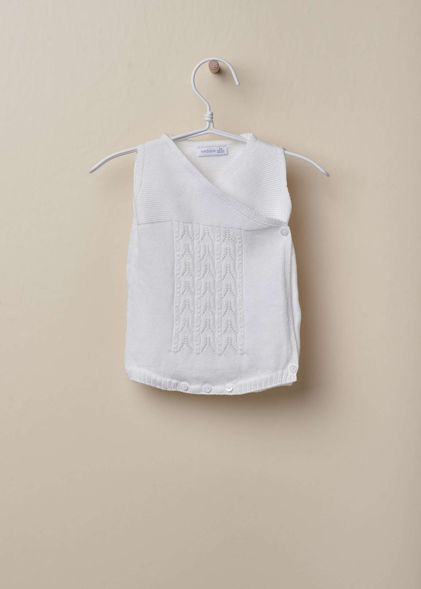 Fofo trespasse tricotado em malha fina de algodão orgânico, suave e respirável, ideal para bebés recém nascidos. O fofo de manga curta LOVE aperta na frente e entre pernas com botões madre pérola. Produzido em Wholegarment, uma peça completa sem costuras, para maior conforto do seu bebé.