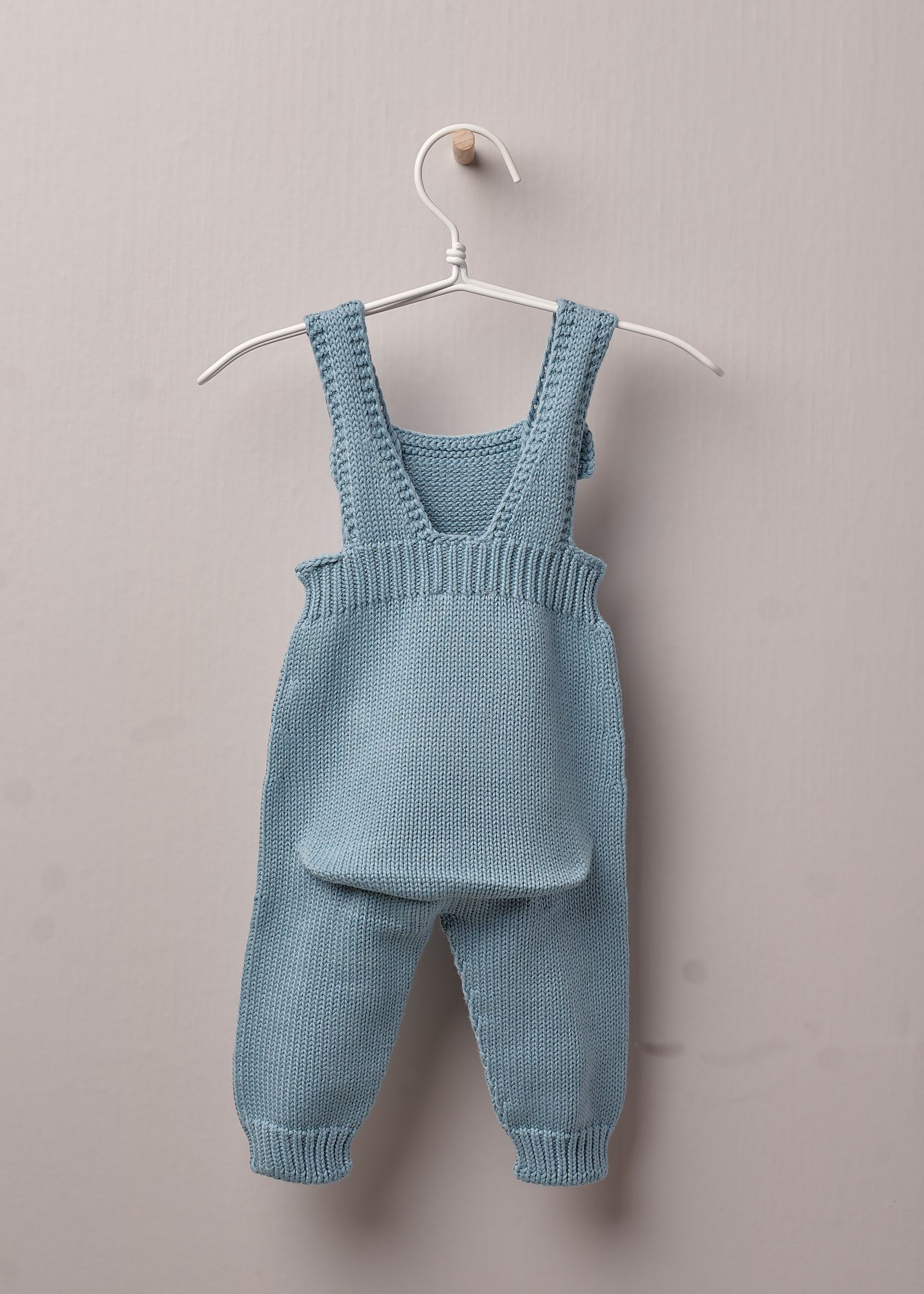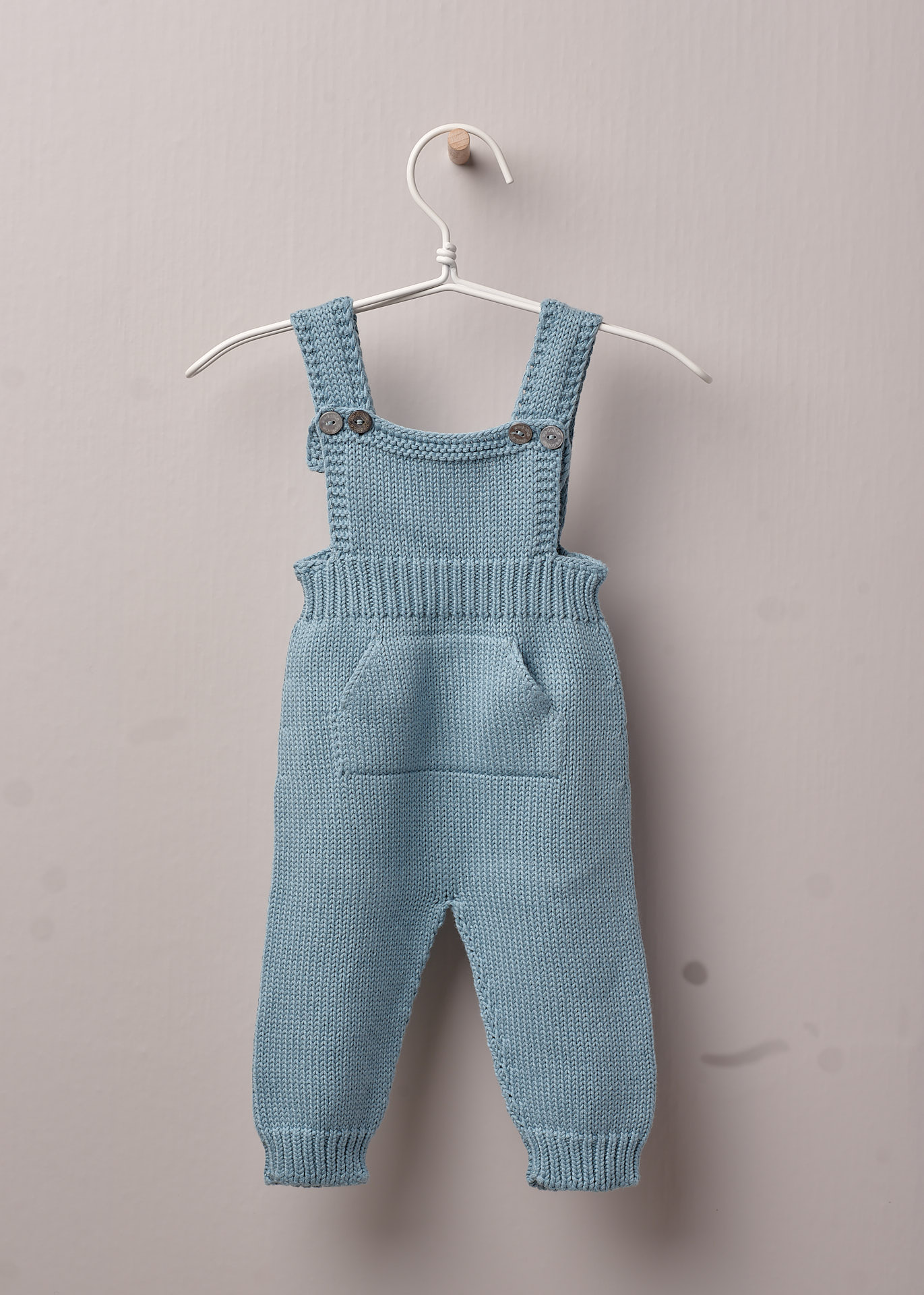 Jardineira de alças em malha, com bolso na frente, aperta nas alças na frente com botões madre pérola. Produzido em Wholegarment, uma peça completa sem costuras, para maior conforto do bebé.