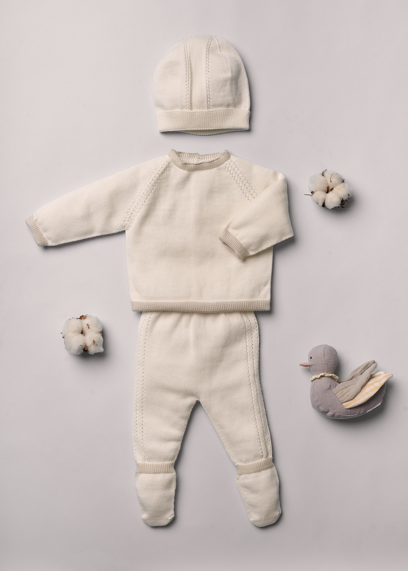 Calça com pé em malha de algodão orgânico, ideal para bebé recém nascido. Produzido em Wholegarment, uma peça completa sem costuras, para maior conforto do bebé.
