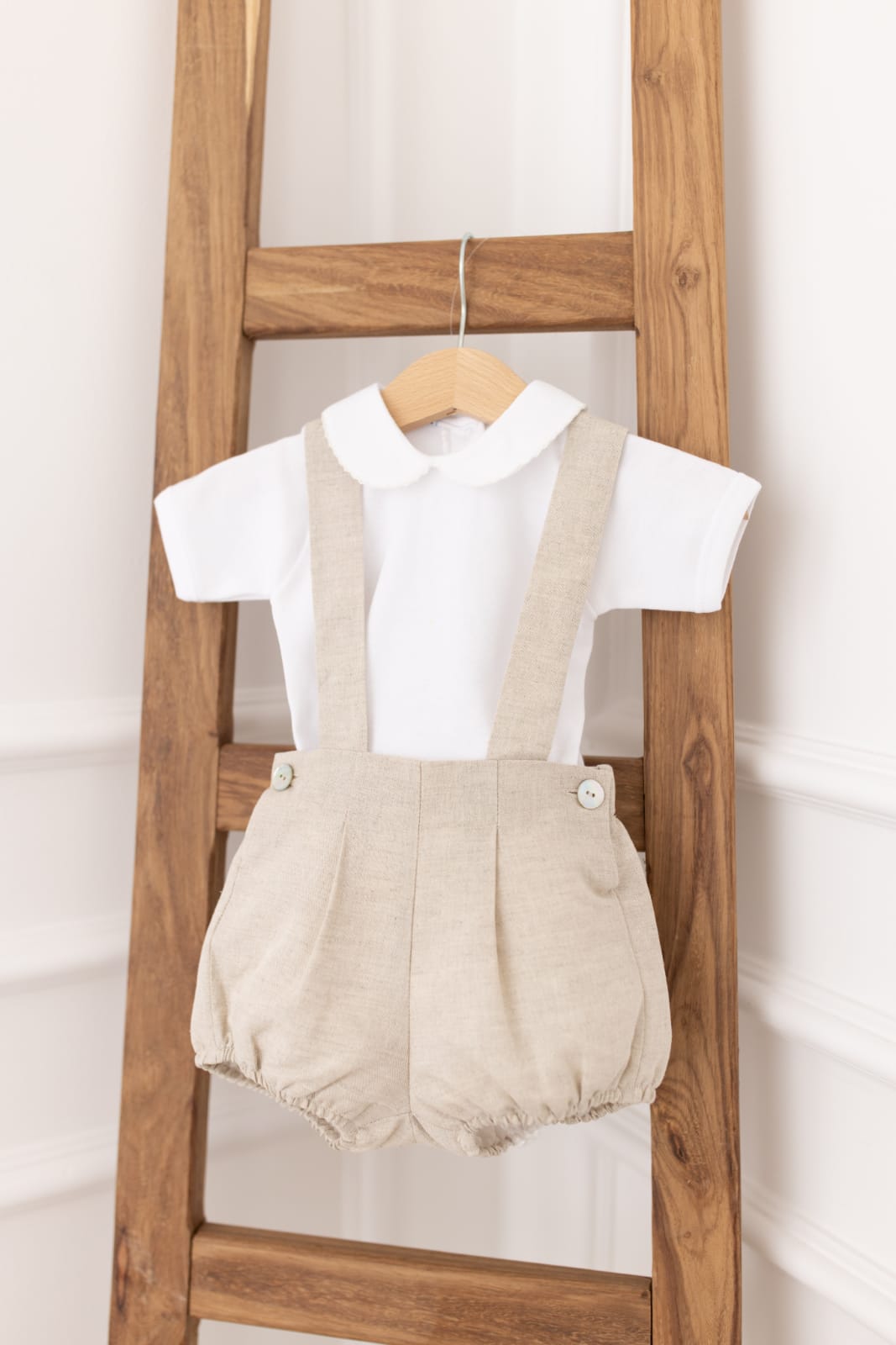 Calção de alças em linho cruzado nas costas. Uma peça produzidas em tecido de algodão e linho, forrado em algodão leve para maior conforto. Aperta atrás, nas alças, com botões de madre pérola.