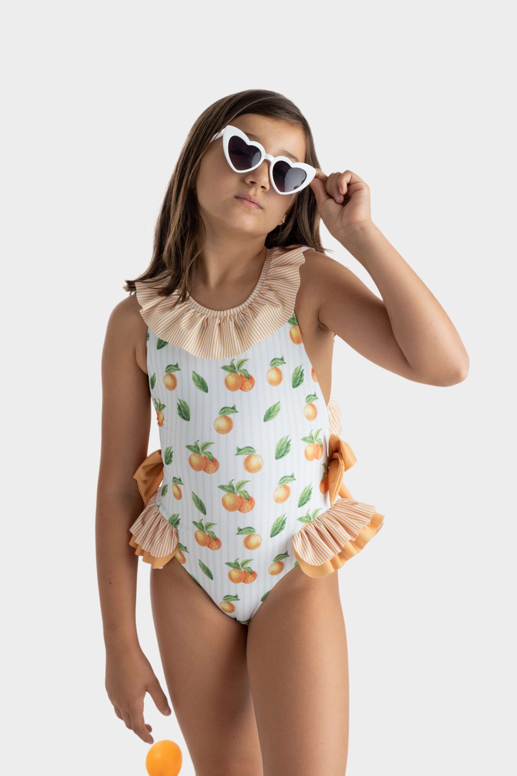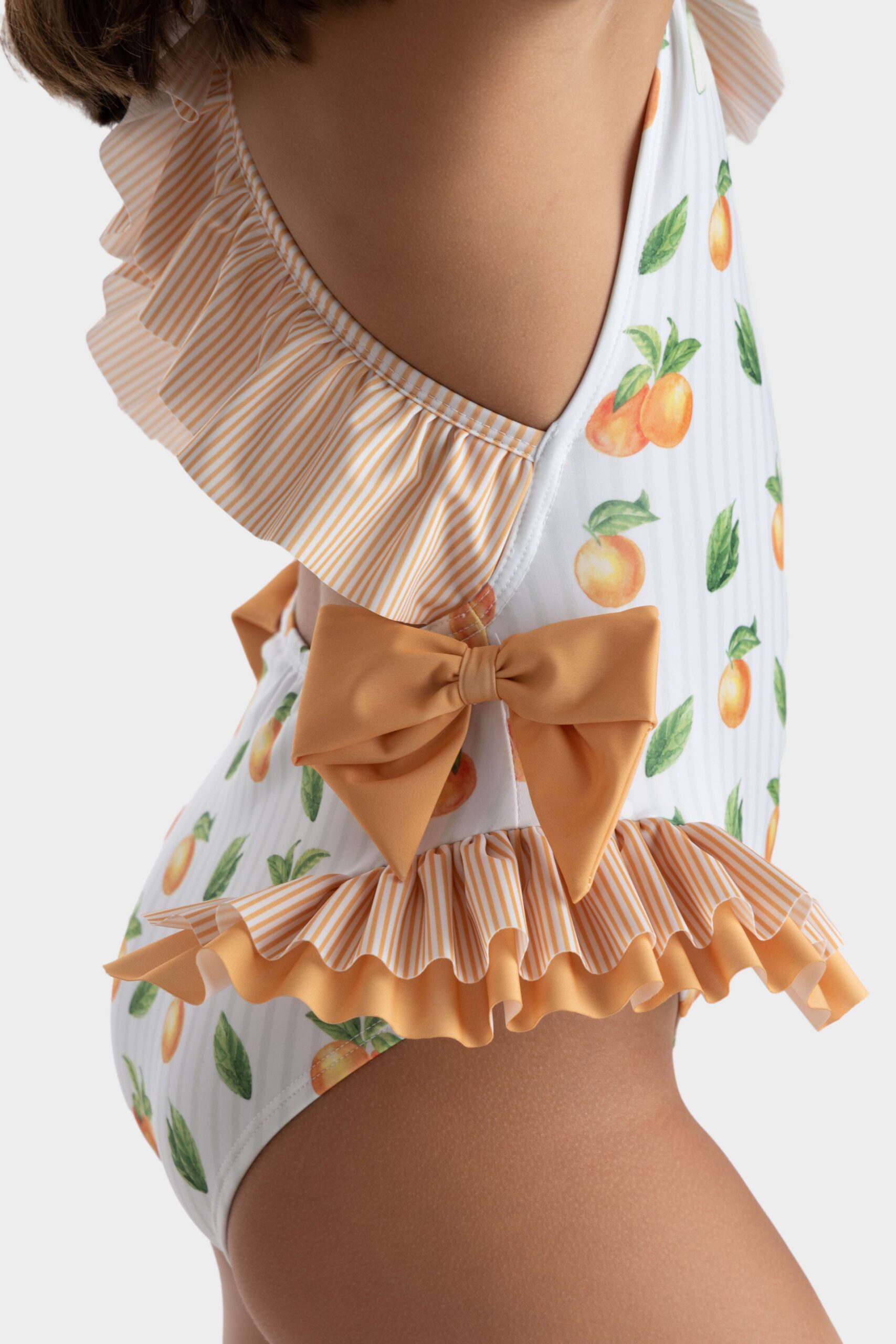 Fato de banho Cannes. Fato de banho com gola em folho, pormenor de folho duplo e laços nas laterais . Costas cruzadas com acabamento em folho largo.