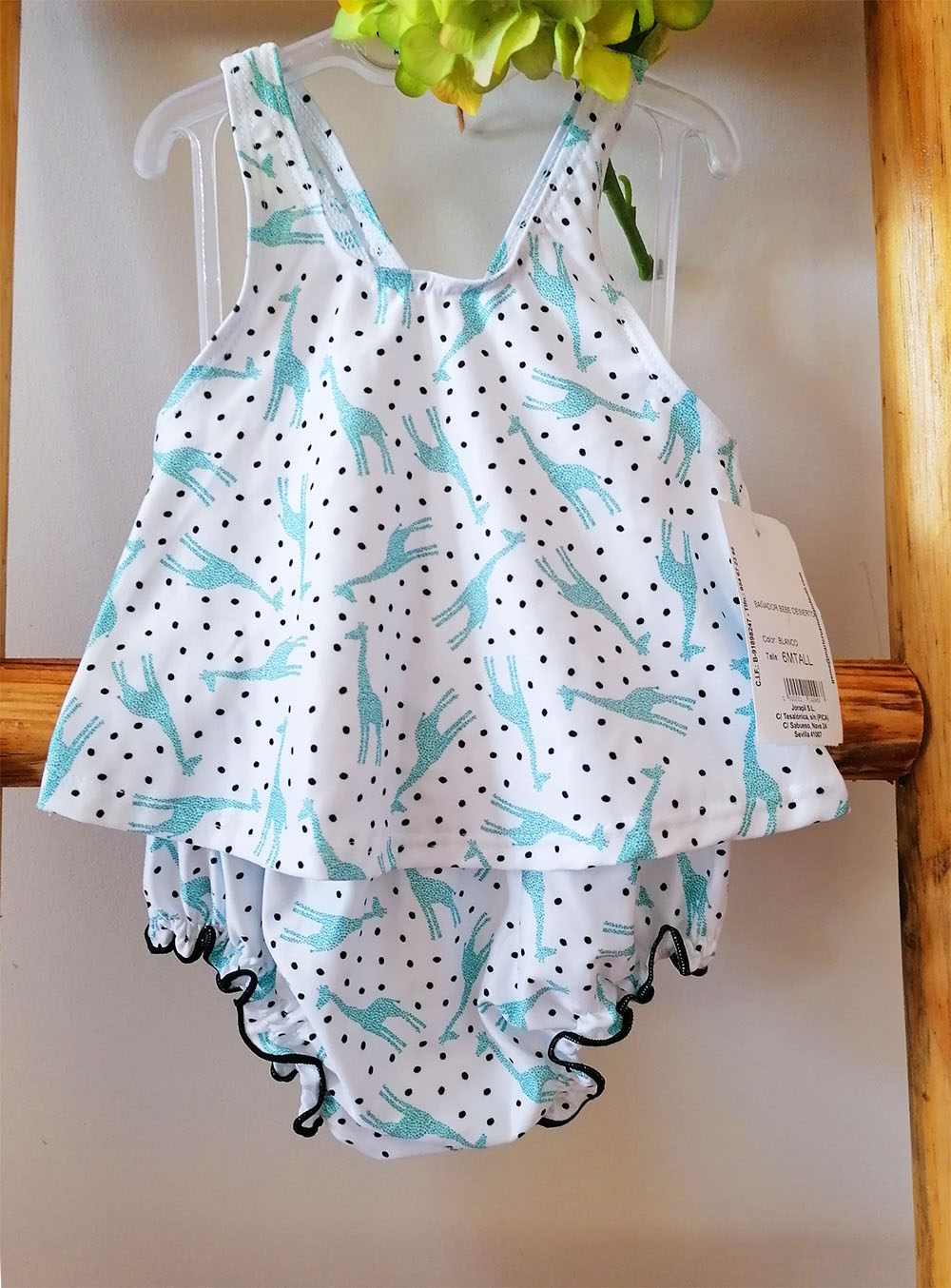 Coleção Deserto. Fato de banho estampado girafas e pormenor de folho